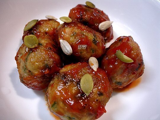 굴림만두를 살짝 튀겨서 케찹, 고추장, 스위트칠리소스를 넣고 조린거예요.