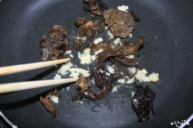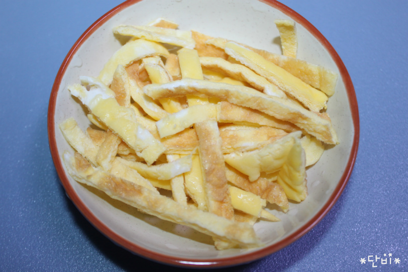 목이버섯 한 줌, 사각 어묵 2장, 달걀지단