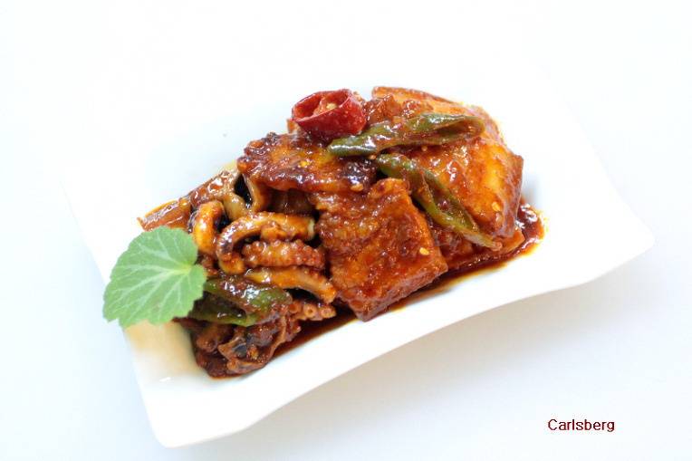 기본재료 : 삼겹살 600g. 낙지 2마리. 청양고추 2개. 붉은고추 1개.