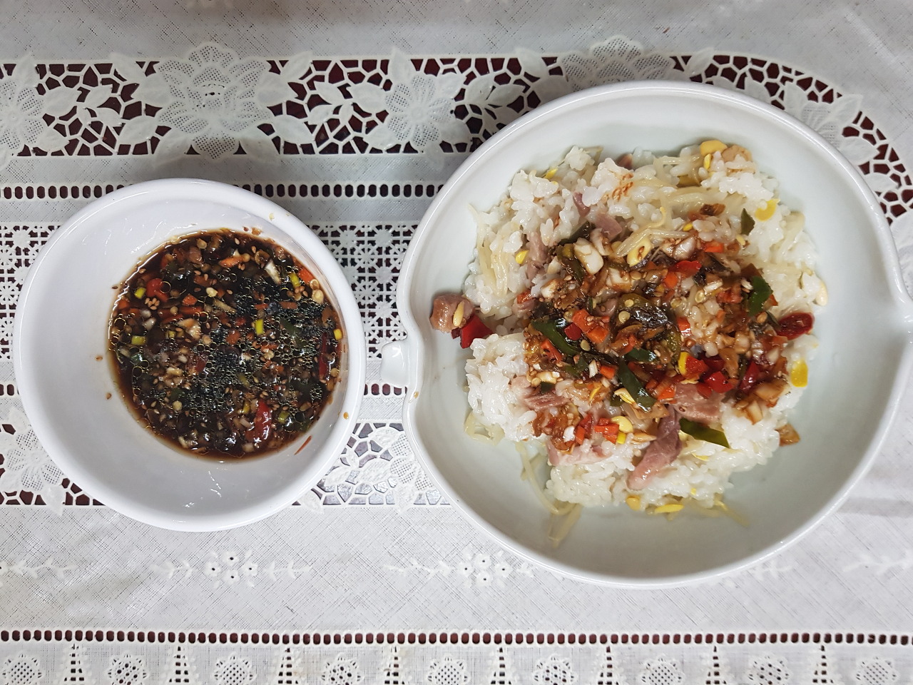 | 먼저 쌀을 씻어 30분 정도 불려준다 콩나물 씻어주고 당근 반개를 썰어준다. 등심을 넣어 주었는데 돼지고기나 소고기 상관없이 넣어주면 더 맛있다. 불린 쌀위에 콩나물 당근 고기 순으로 올려주교 백미 취사 시작~~~ 간단 양념장을 만들어 준다. 양념장 레시피 진간장 7스푼 설탕 반스푼 다진마늘 한 스푼 고추가루 반스푼 참기름 한 스푼 통깨 한 스푼 밥이 다 되면 그릇에 담아 양념장을 올려 비며 먹으면 된다. |
