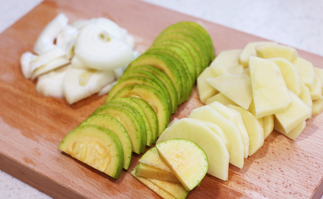 4. **재료 손질**: 감자, 양파, 대파, 애호박, 당근 등의 재료를 적당한 크기로 썰어줍니다.