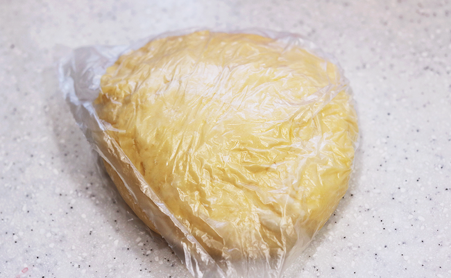 반죽이 어느 정도 완성되면, 반죽을 비닐이나 랩으로 싸서 냉장고에 30분 이상 숙성시켜줍니다.
