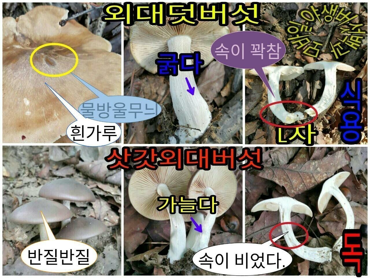 ◇ 화경버섯(독), 느타리(식용), 표고버섯(식용).