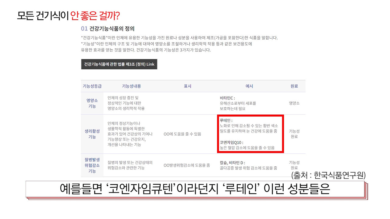 예를들어 코엔자임큐텐이나 루테인 같은 성분을 보면, 기능성원료로 인증받은 제품이 건강기능식품으로만