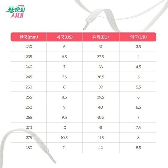 ex. 한국 230 mm = 미국 6 US = 유럽 37 EU = 영국 3.5 UK
