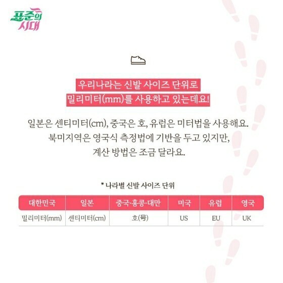 우리나라는 신발 사이즈 단위로 밀리미터(mm)를 사용하고 있는데요!