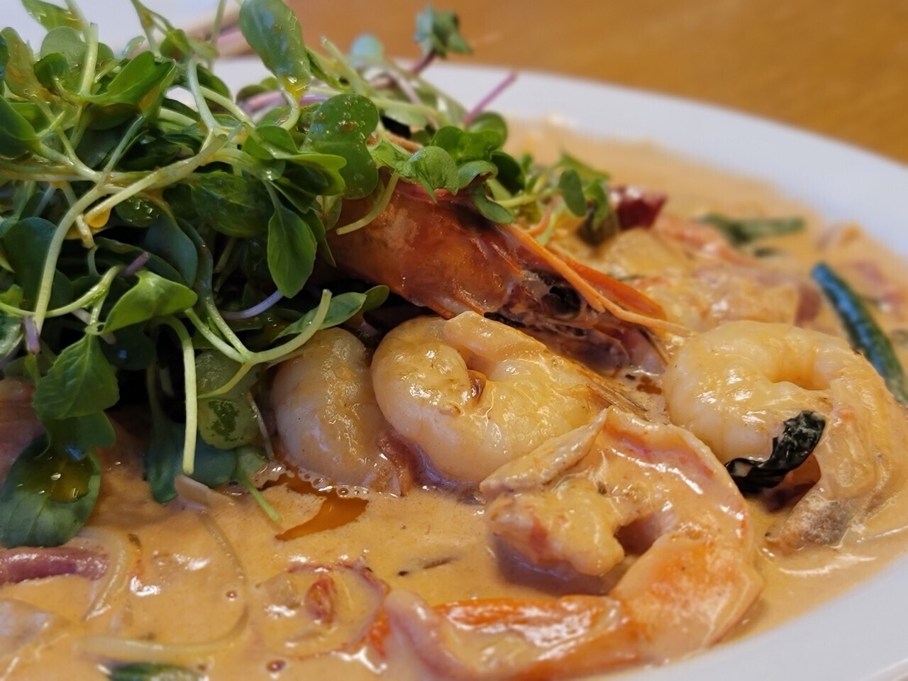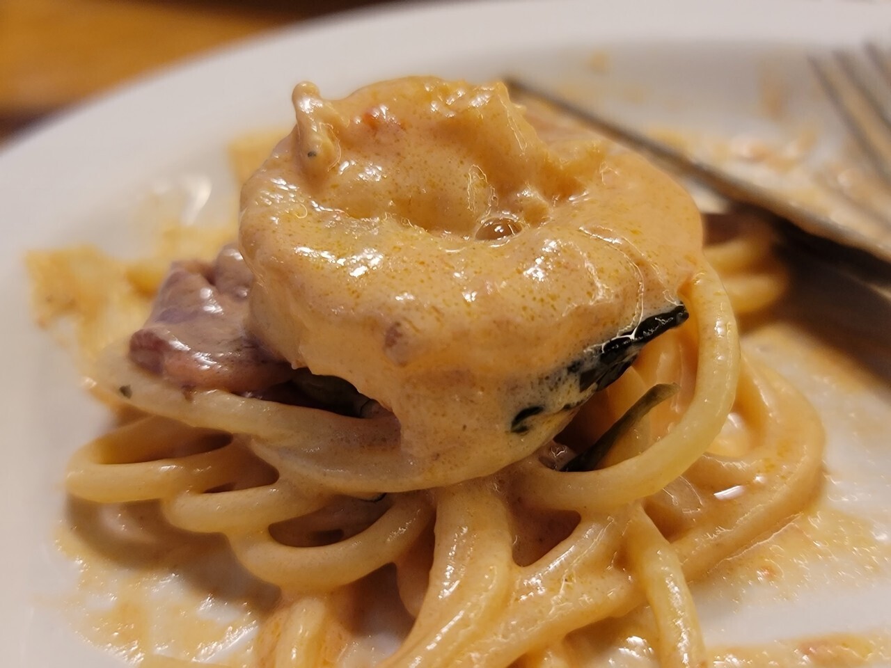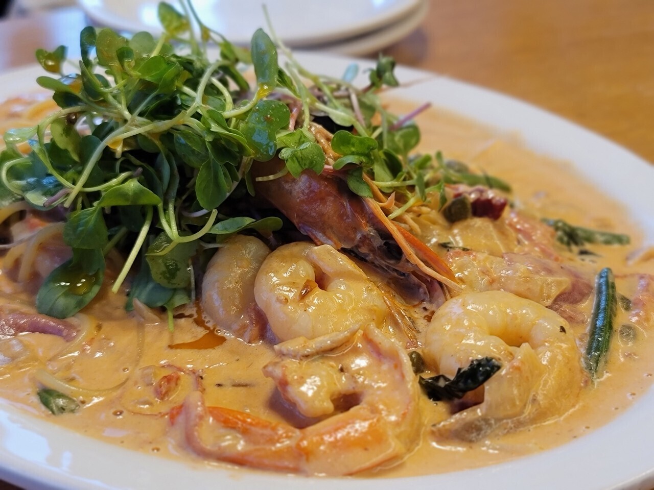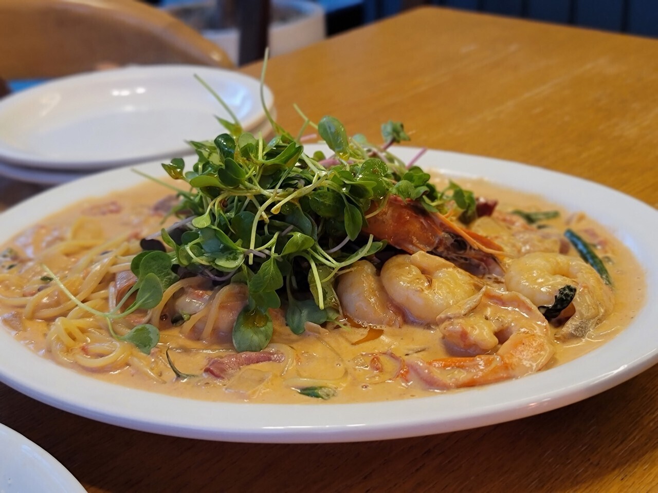 새우와 캐이퍼, 모시조개, 그린빈, 썬드라이 토마토, 베이컨, 루꼴라가 들어간 로제파스타입니다.