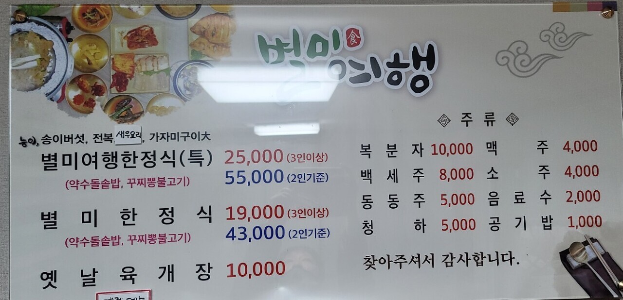 강원도 고성군의 가성비 최강의 한정식 맛집인 별미여행 입니다. 지난번 방문이후 그맛을 못잊어 요번 낑겨가는 먹방 모임에 강력 추천하여 찿아간 곳입니다. 모든 메뉴 놋그릇에 담아 정성 가득하고 모든 음식 하나하나 다 메인같이 맛이 있을 정도로 입니다. 평소에 웨이팅이 너무 심해 각종 메스컴에 방송요청이 쇄도하지만 전부 거절을 하는 집입니다. 구찌뽕 불고기와 약수물로 지은 돌솥밥이 메인이고 나머지 음식도 하나하나 정성이 들어간 곳입니다. 서울에서는 도저히 이가격에 못내어 놓을 그런 음식 구성 입니다. 속초에서 10분거리 이기 때문에 속초여행 오시는 분들 꼭 한번 방문해 보시길 적극 권유해 드립니다. 진심 맛난집 꼳 한번 가보시길..