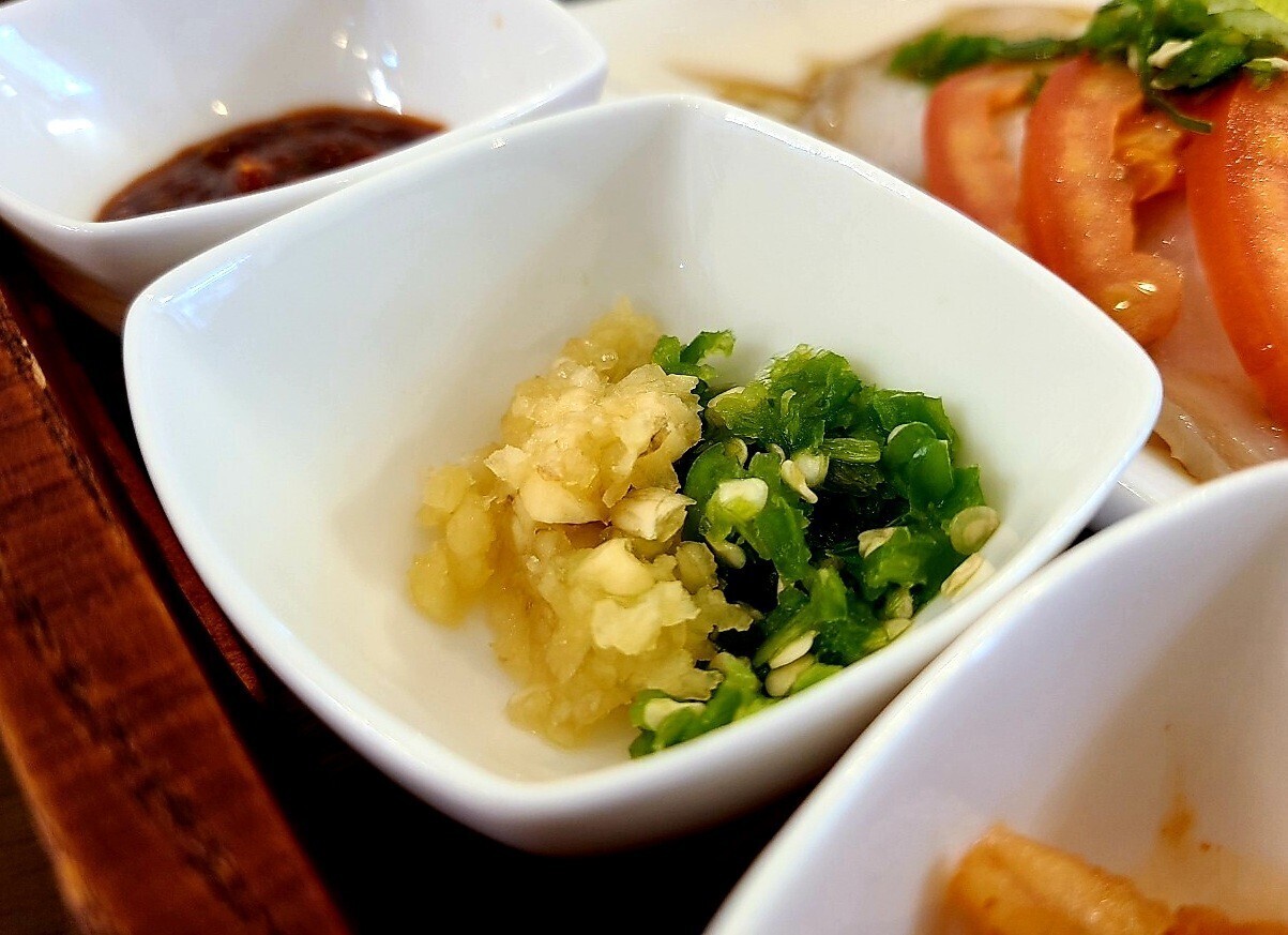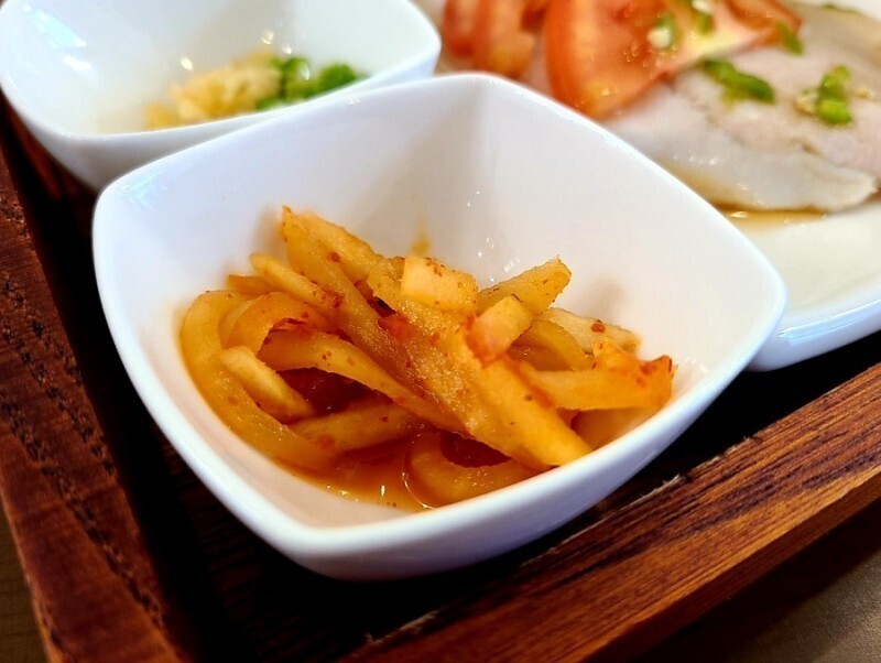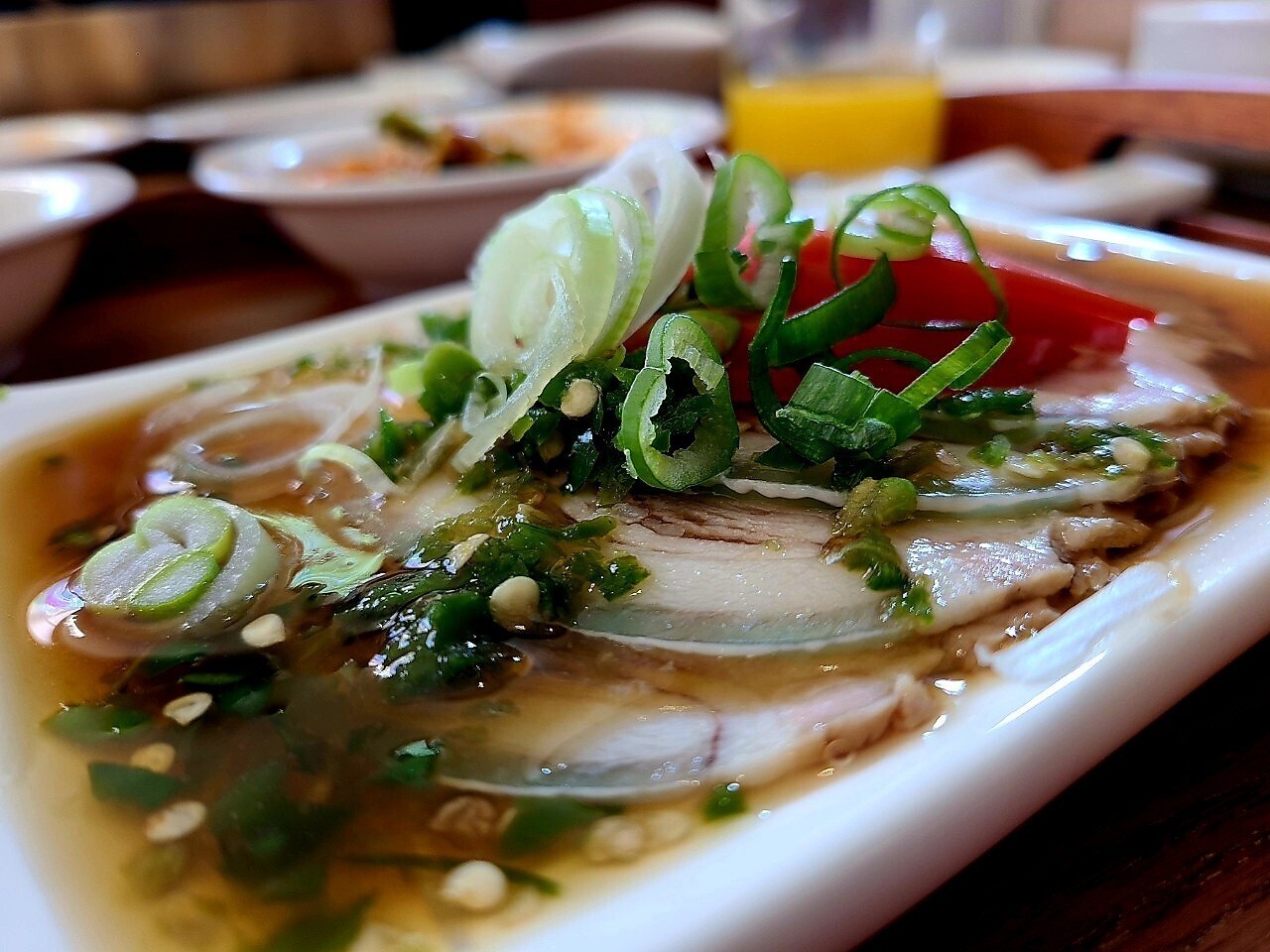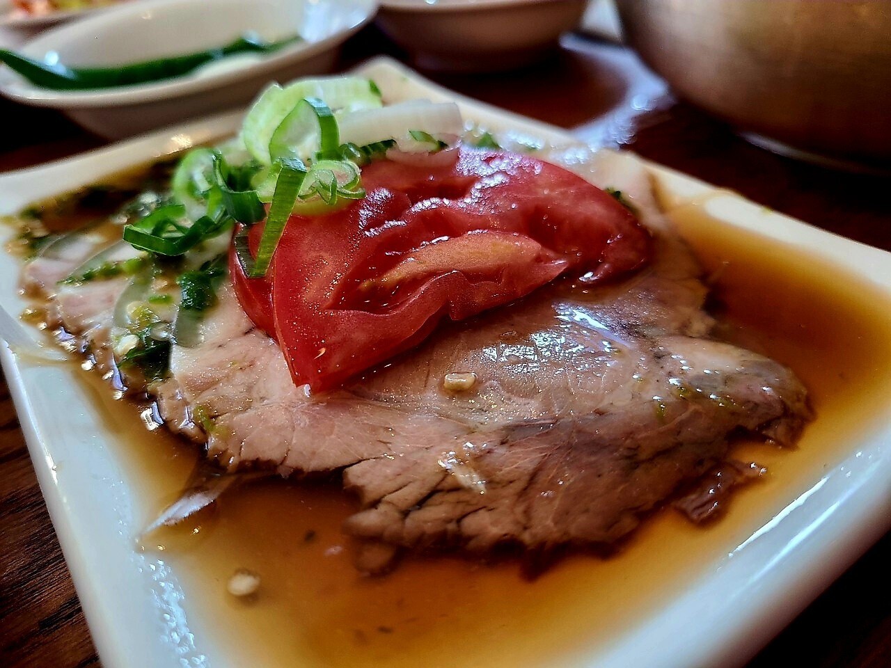 부드러운 수육에 양념장과 청양고추를 올려서ᆢ