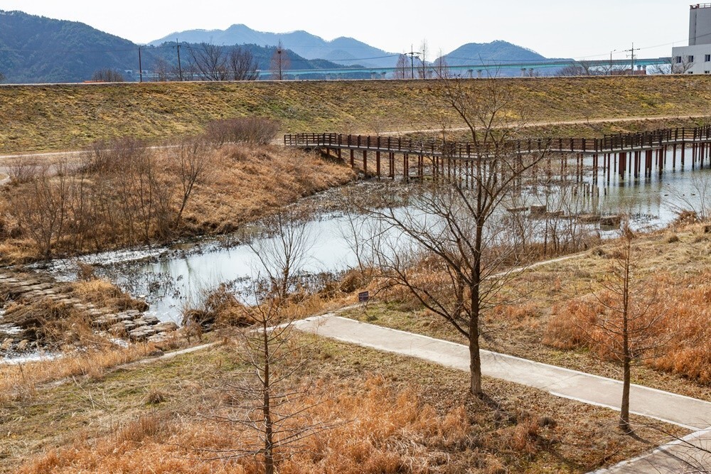 조용한 시골역 풍경을 뒤로하고 삼랑진역의 자랑거리인 근대문화유산 삼랑진 급수탑으로 가봅니다. 삼랑진역에서 삼랑진역 급수탑까지는 좌측 방향으로 약 1, 2km거리에 있는데요. 자동차로는 2분, 도보로 걸어도 15분이면 충분합니다. 삼랑진 지하차도와 교량을 지나자마자 삼랑진 송지시장 입구에서 우측 미전천 방향으로 가시면 되는데요. 삼랑진역 급수탑 앞에 생태하천인 미전천 둘레길이 있어 힐링 산책하기에도 좋았어요.