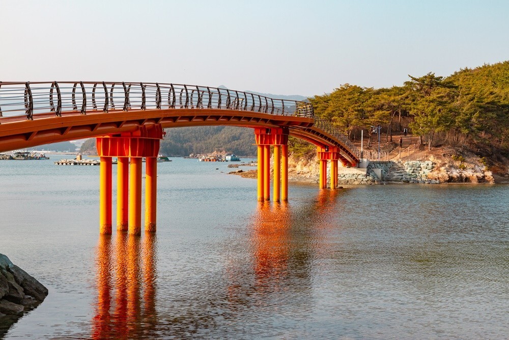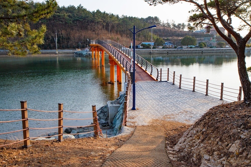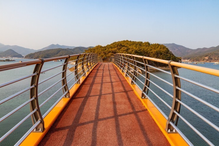 고성 삼산면 룡대미 어촌 체험마을의 무인도 보리섬으로 걸어서 가 볼까요? 섬 입구에 무인도를 걸어서 가게 만든 보리섬 대보교가 있습니다. 고성 대포마을과 맥도 보리섬에서 한 글자씩 따서 '보리섬 대보교'라고 이름 붙였다고 합니다. 다리 길이는 100미터가 조금 안되는 길이로 중간 지점에 원형 전망대가 있고 강렬한 주황색이라 멀리서도 눈에 확 들어오더라고요.