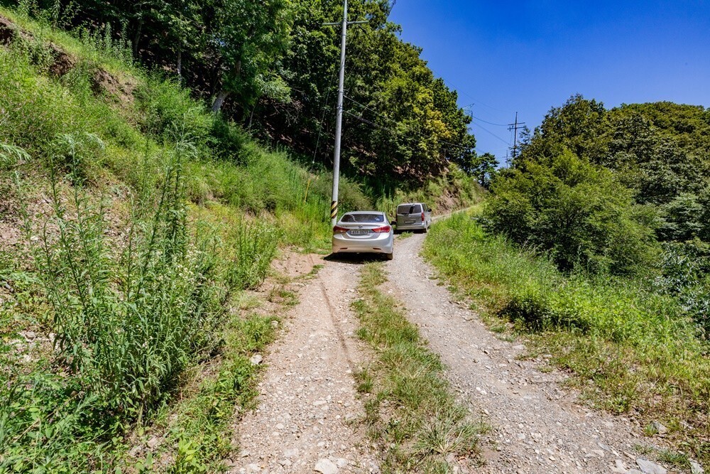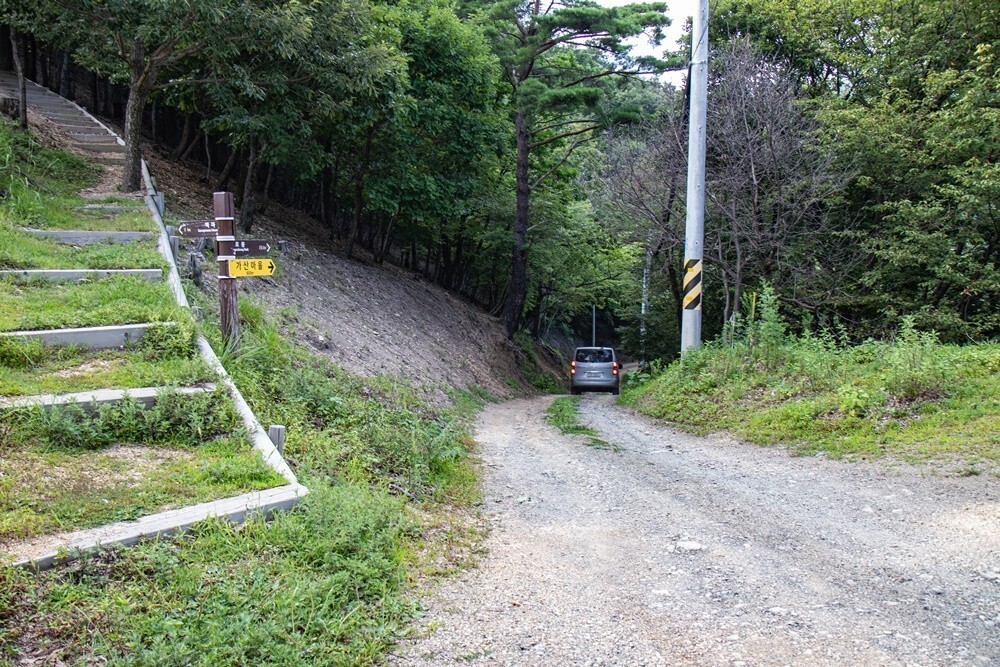 그동안 밀양 오지로만 알았던 바드리 마을에서 4km 산길을 더 달려서 가산마을을 600m 남겨 두고 가장 넓은 임도 공간을 만났어요. 알고 보니 이곳은 백마산 정상과 향로봉으로 가는 길림 길이었고, 주차할 수 있는 공간도 어느 정도 있더라고요. 바드리마을 주차장에 주차해두고 도보로 가산마을까지 임도 따라 왕복으로 트레킹 하게 되면 왕복 8km에 2시간 소요된다고 하니 트레킹 코스로 이용해도 좋을 것 같습니다.