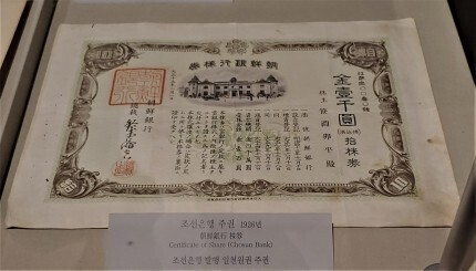 1926년 발행된 조선은행 주권. 10주짜리 1천원 권으로, 조선은행 자본금이 8천만원으로 증액되던 시점에 발행된 주권으로 추정.ⓒ 이영천(우리은행 은행사박물관)
