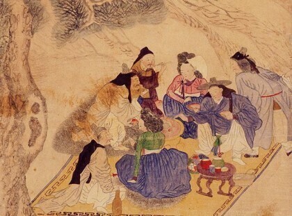 ▲ 야외에서 기생들을 끼고 화롯불에 고기를 구워먹는 조선 양반들. 이익은 부유한 집에서는 매일 7번 식사를 하고 100명분을 하루에 먹어치웠다고 썼다. 작자미상 풍속화(일부). 국립중앙박물관 소장