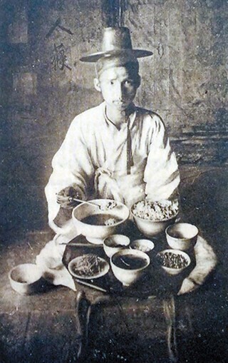▲ 조선시대 밥상. 조선시대에는 한번에 3인분의 식사를 했다. 19세기 프랑스 엽서의 사진