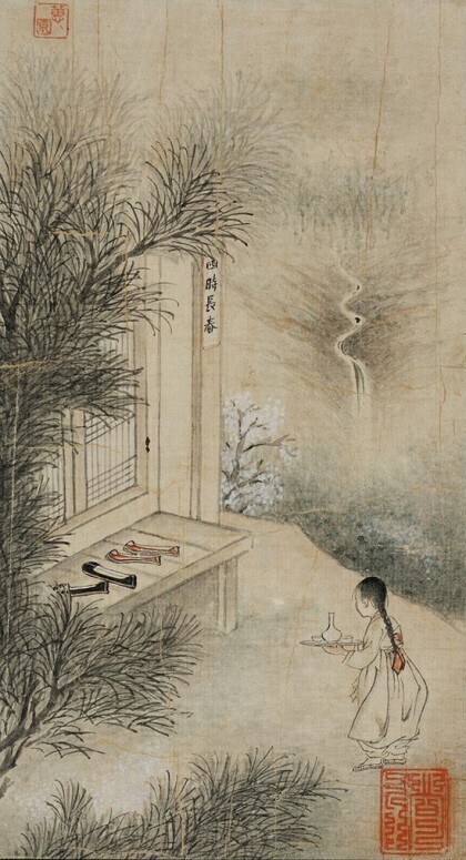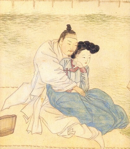 남녀 둘만 있는 방 앞에서 어쩔 줄 몰라하는 소녀가 웃음을 자아낸다. 국립중앙박물관 소장