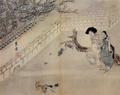 ▲ 신윤복 작 이부탐춘.개가 교미하는 장면을 보면서 두 여인이 얼굴을 붉히고 있다. 간송미술관 소장