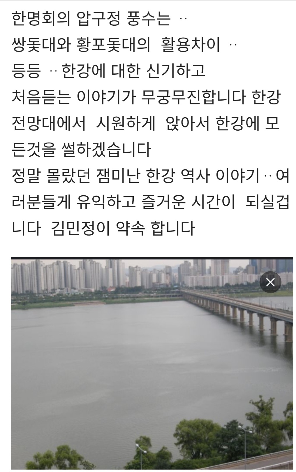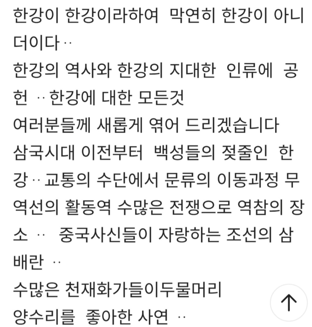 한강을 말하다 ᆢ 작성자김민정|작성시간26.04.07|조회수324 목록 댓글 1 글자크기 작게가 글자크기 크게가 다음검색 현재 게시글 추가 기능 열기 북마크 공유하기 신고 센터로 신고 댓글 댓글 1 댓글쓰기 답글쓰기 댓글 리스트 작성자섬나리 | 작성시간 26.04.09 멋져요 기대합니다... 댓글 전체보기