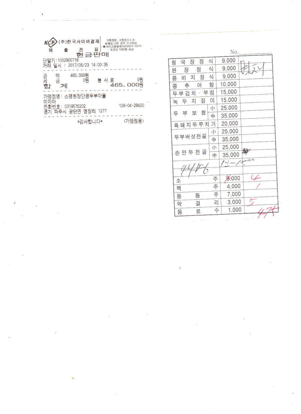 첨부 1)중식비 영수증: 465,000 --- [첨부 1:영수증 , 상호:소령원 장단콩 두부 마을 ]