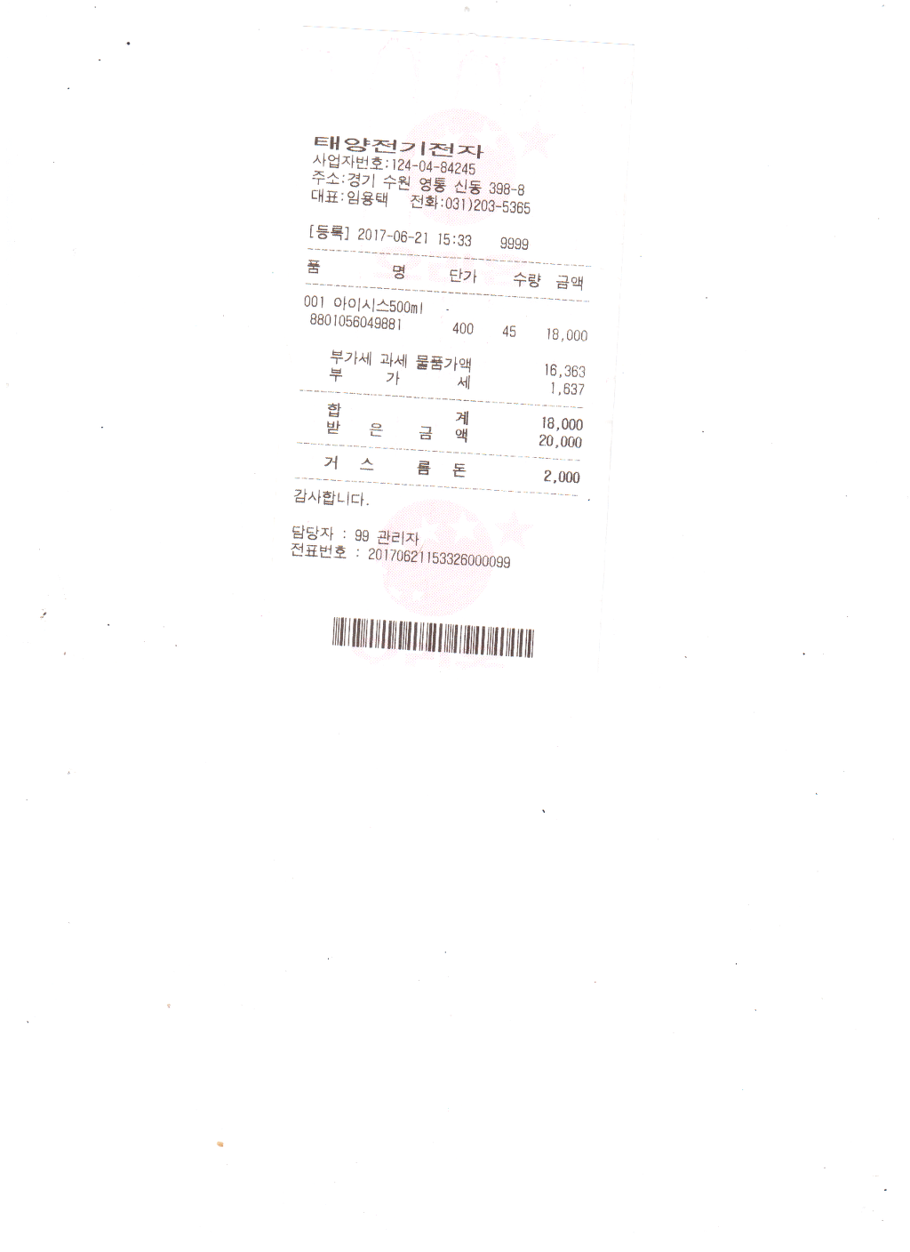 첨부 5)생수 구입비 영수증(400원×45개=18,000원)