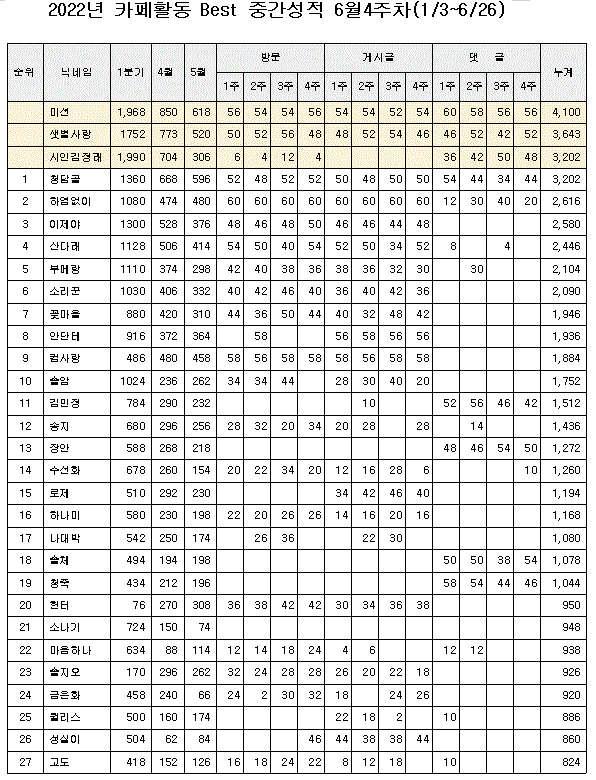 ◆ 평가대상 : 카페 방문 수, 게시글 수(게시판에 게시된 게시물 일체, 자작글,펌,사진,음악 등등.....), 댓글 수