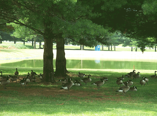 여름철에 구장에 나온 캐나다 기러기들은 그늘에서 휴식를 취한다.