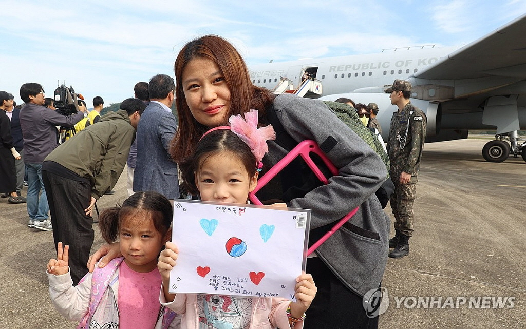 두 딸의 손목을 꼭 붙잡고 무사히 귀국하는 엄마의 모습