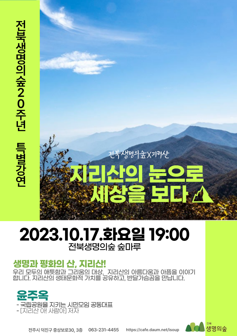 [[접수완료]]전북생명의숲 20주년 특별강연-지리산의 눈으로 세상을 보다! 작성자관리자|작성시간23.10.05|조회수272 목록 댓글 0 글자크기 작게가 글자크기 크게가 전북생명의숲 20주년 기념 특별강연에여러분을 초대합니다! 신청링크https://forms.gle/qyMYoJGrSuTDbhAo8 다음검색 현재 게시글 추가 기능 열기 북마크 공유하기 신고 센터로 신고 댓글 댓글 0 댓글쓰기 답글쓰기 댓글 리스트