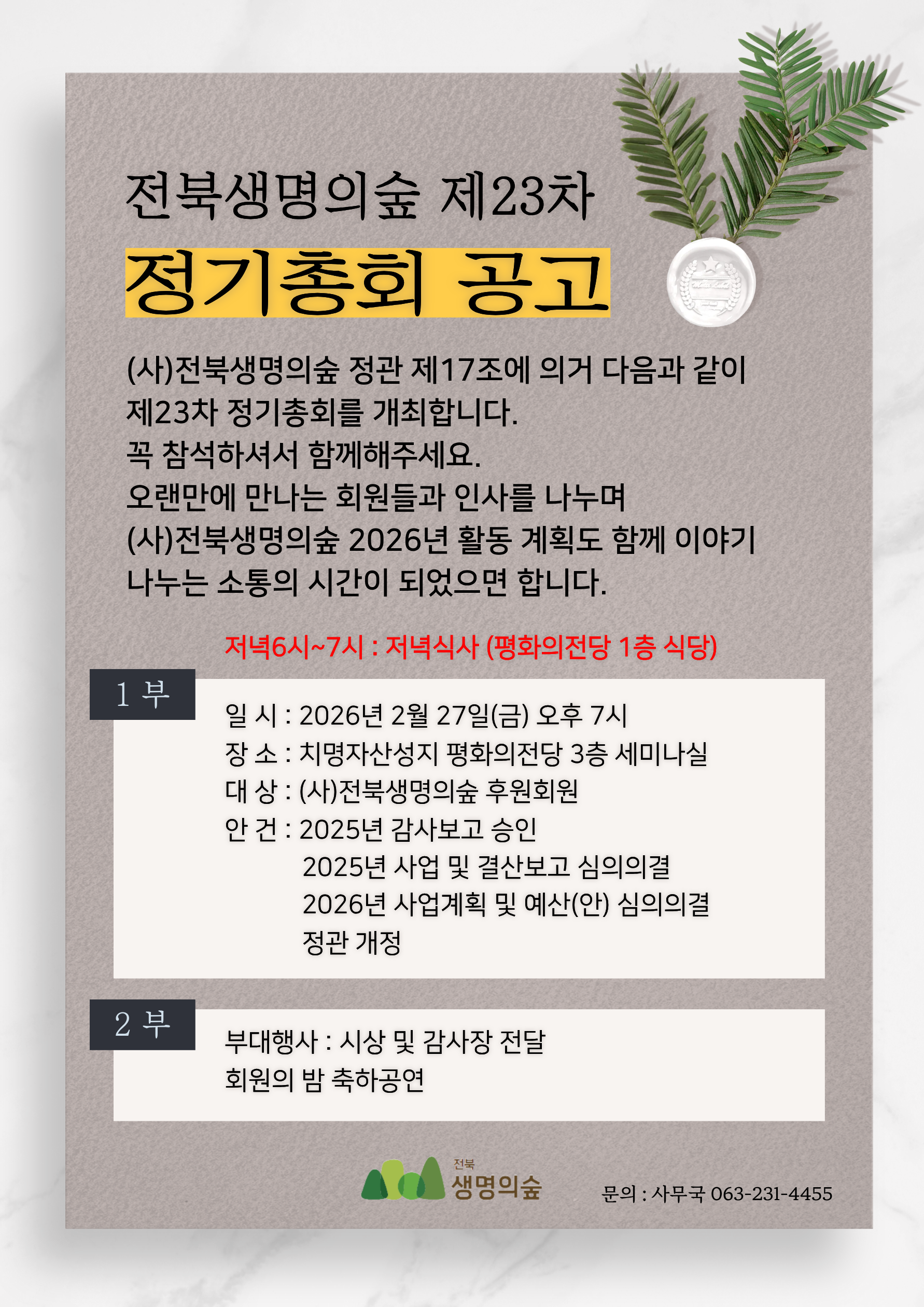 | <정기총회 참여신청 및 위임> https://forms.gle/SESKfmhSecD9QVb8A 회원님 덕분에 지난 한해동안 전북생명의숲 활동이 활기차게 진행될 수 있었습니다. 2025년 활동 내용을 보고 드리고 2026년의 활동 계획과 전북생명의숲의 회원님들과 인사를 나누며 함께 소통하는 시간이 되었으면 합니다. 많은 관심과 참석으로 2026년 처음 시작의 시간에 함께해주세요^^ |