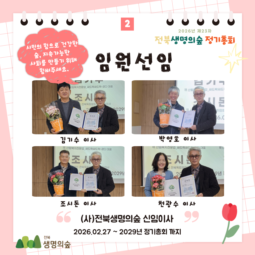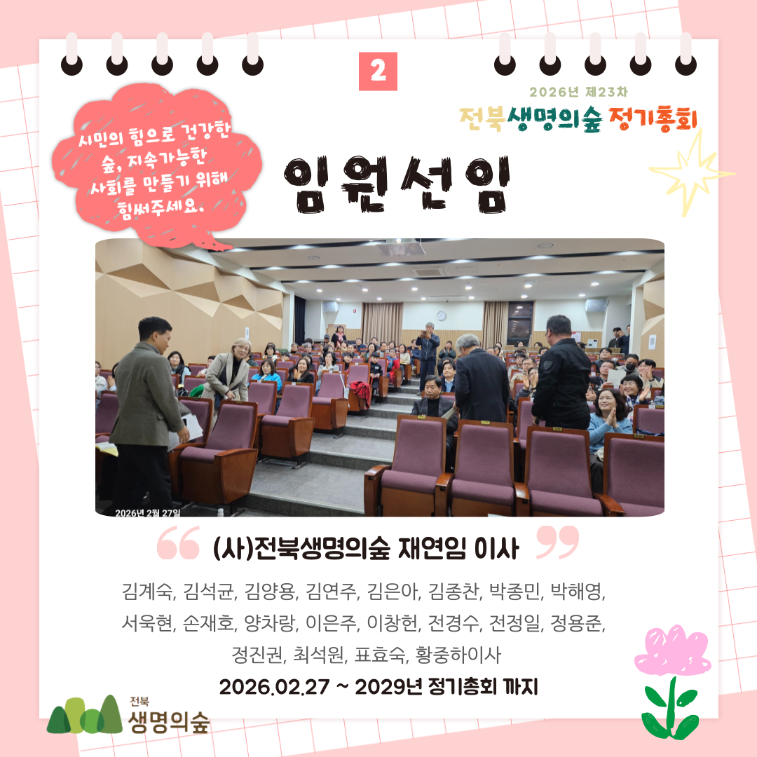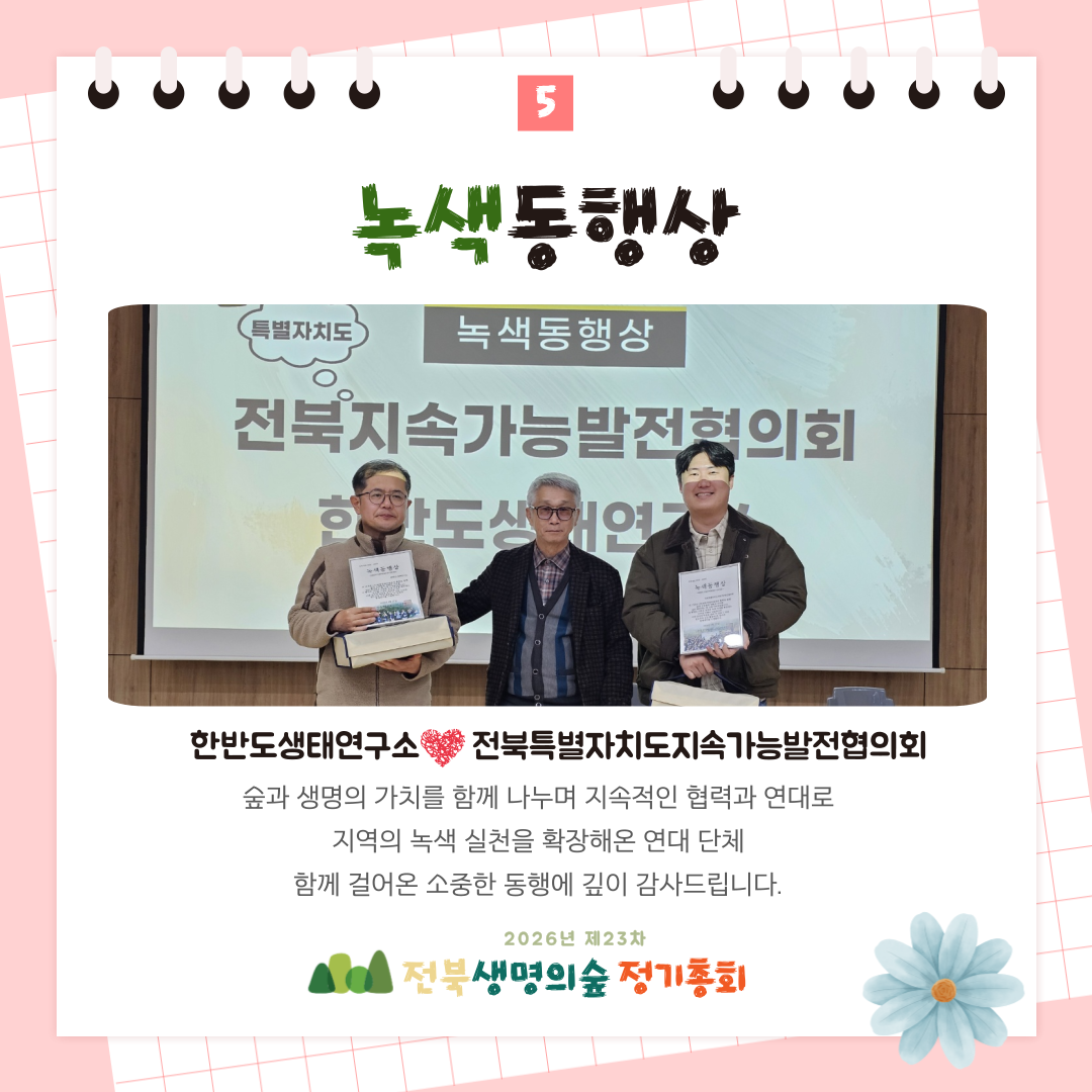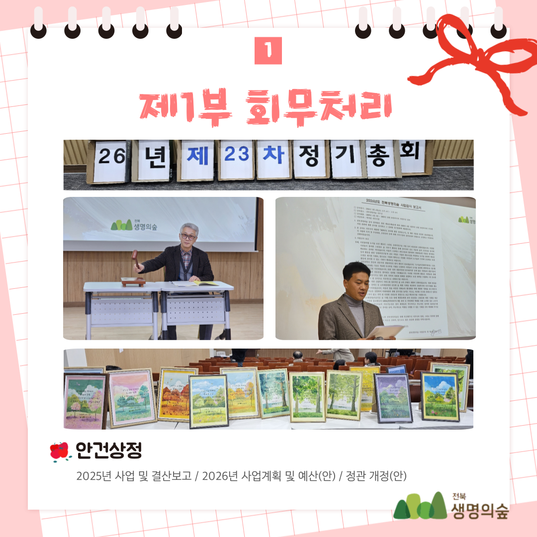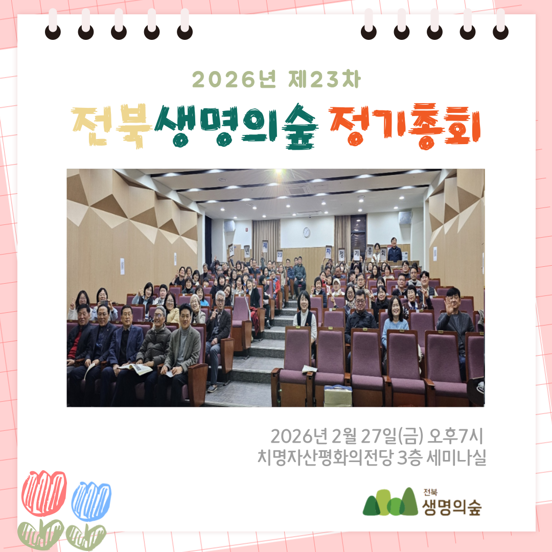 제23차 전북생명의숲 정기총회 활동보고 작성자관리자|작성시간26.03.04|조회수81 목록 댓글 0 글자크기 작게가 글자크기 크게가 다음검색 현재 게시글 추가 기능 열기 북마크 공유하기 신고 센터로 신고 댓글 댓글 0 댓글쓰기 답글쓰기 댓글 리스트