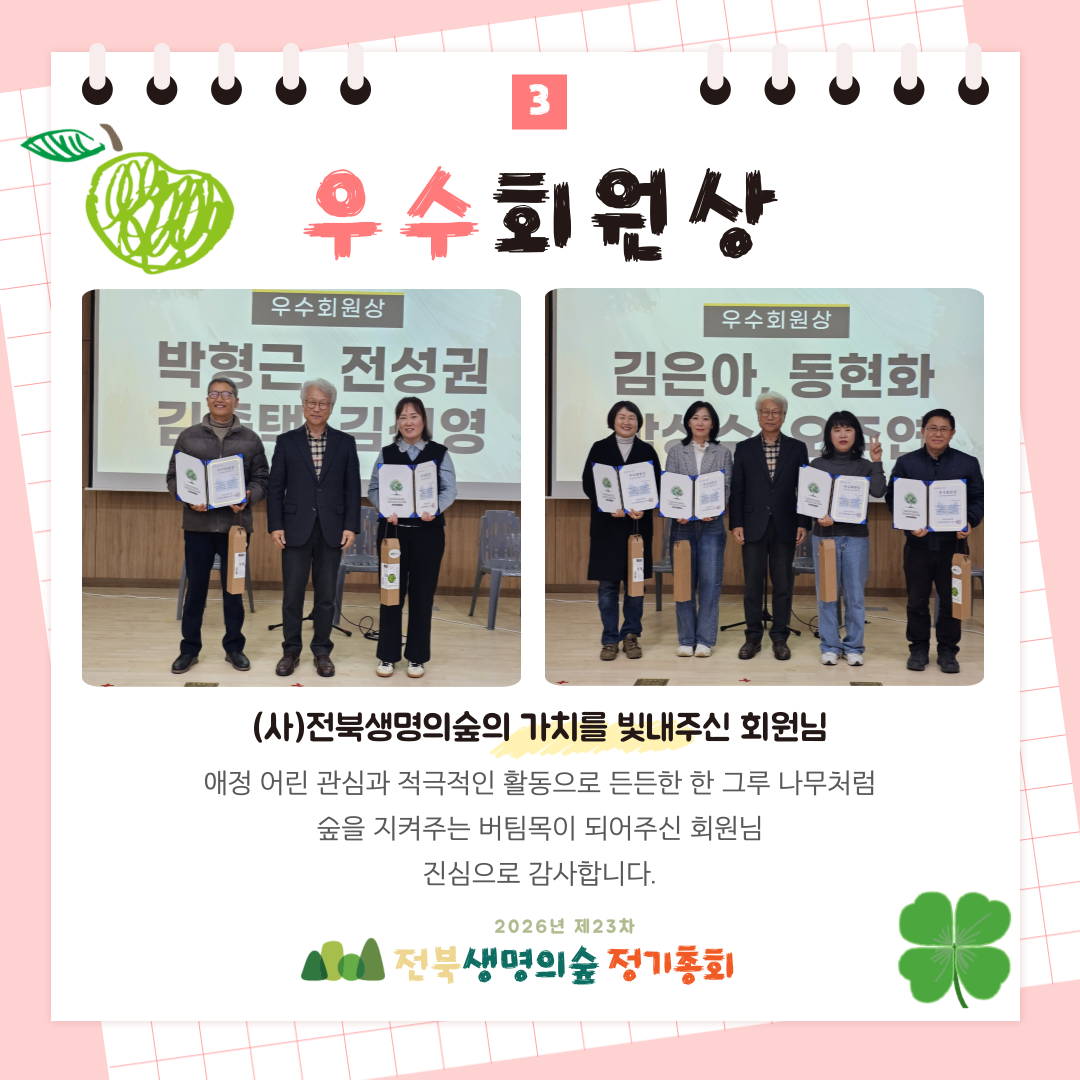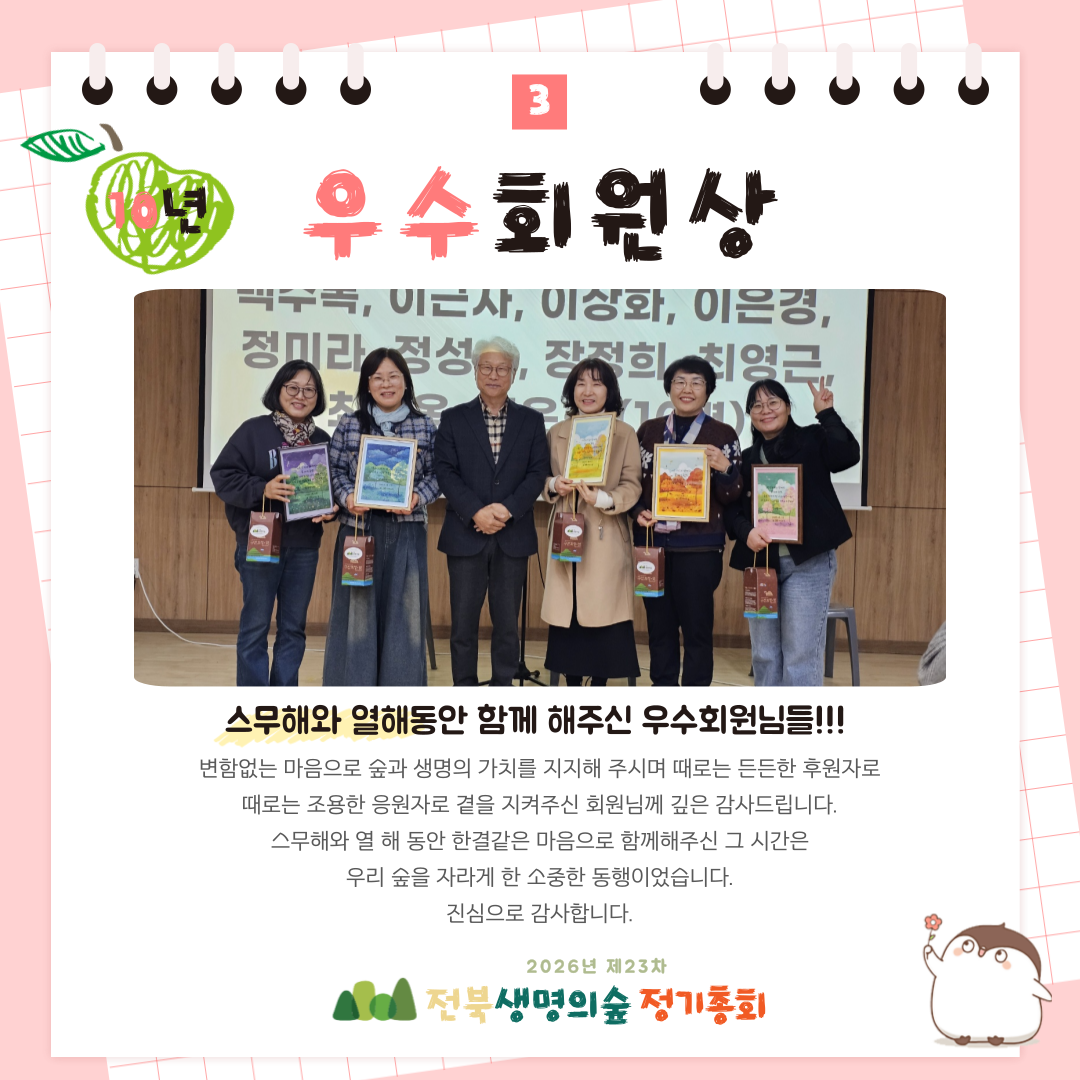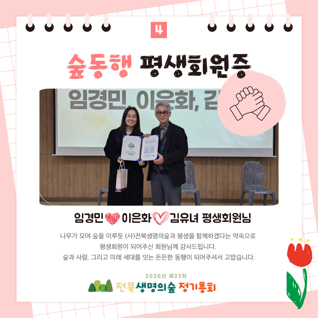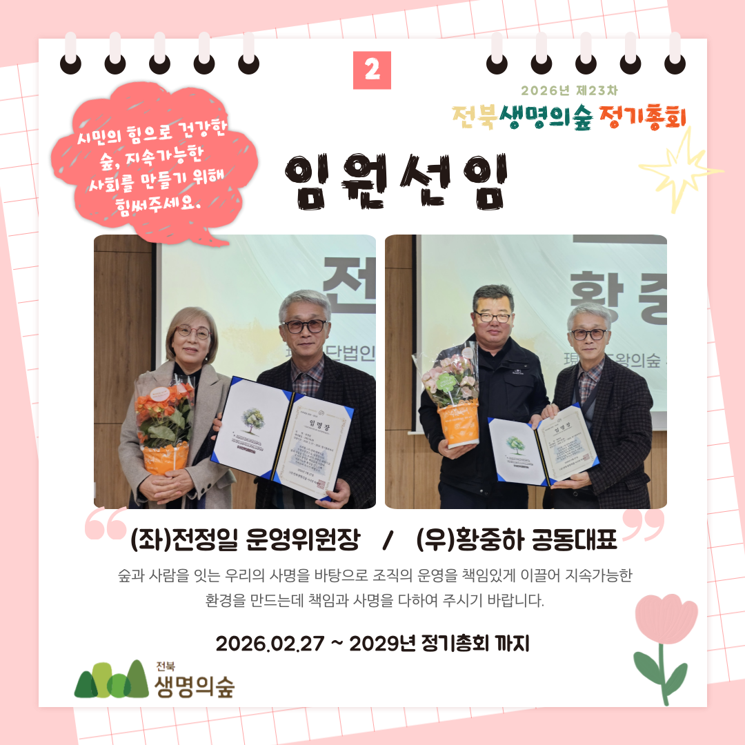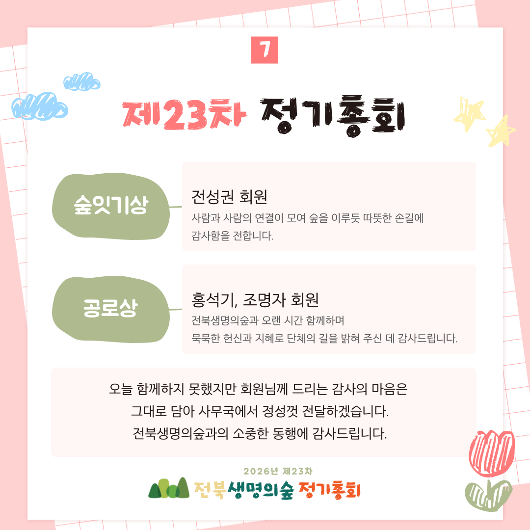 제23차 전북생명의숲 정기총회 활동보고 작성자관리자|작성시간26.03.04|조회수81 목록 댓글 0 글자크기 작게가 글자크기 크게가 다음검색 현재 게시글 추가 기능 열기 북마크 공유하기 신고 센터로 신고 댓글 댓글 0 댓글쓰기 답글쓰기 댓글 리스트