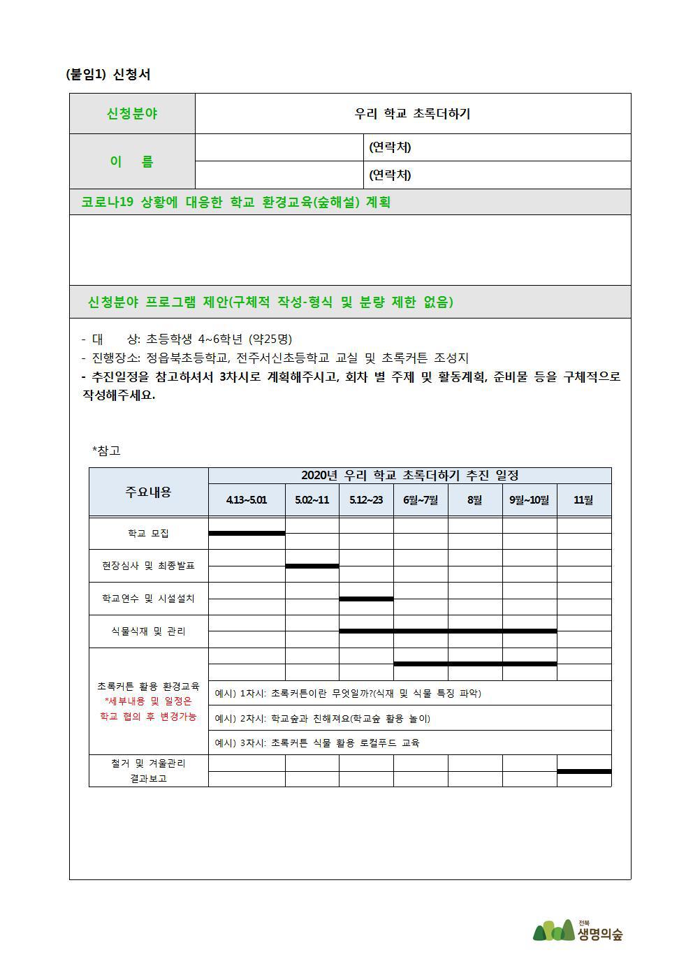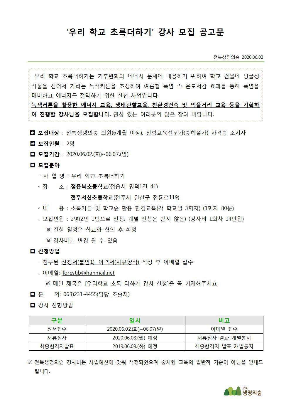 '2020년 우리 학교 초록더하기' 강사 모집 공고 작성자관리자|작성시간20.06.02|조회수239 목록 댓글 0 글자크기 작게가 글자크기 크게가 신청서 2020 초록더하기 강사모집 및 신청서.hwp 첨부파일첨부된 파일이 3개 있습니다. jpg 파일 2020 초록더하기 강사모집 및 신청서001.jpg 다운로드 jpg 파일 2020 초록더하기 강사모집 및 신청서002.jpg 다운로드 hwp 파일 2020 초록더하기 강사모집 및 신청서.hwp 다운로드 다음검색 현재 게시글 추가 기능 열기 북마크 공유하기 신고 센터로 신고 댓글 댓글 0 댓글쓰기 답글쓰기 댓글 리스트
