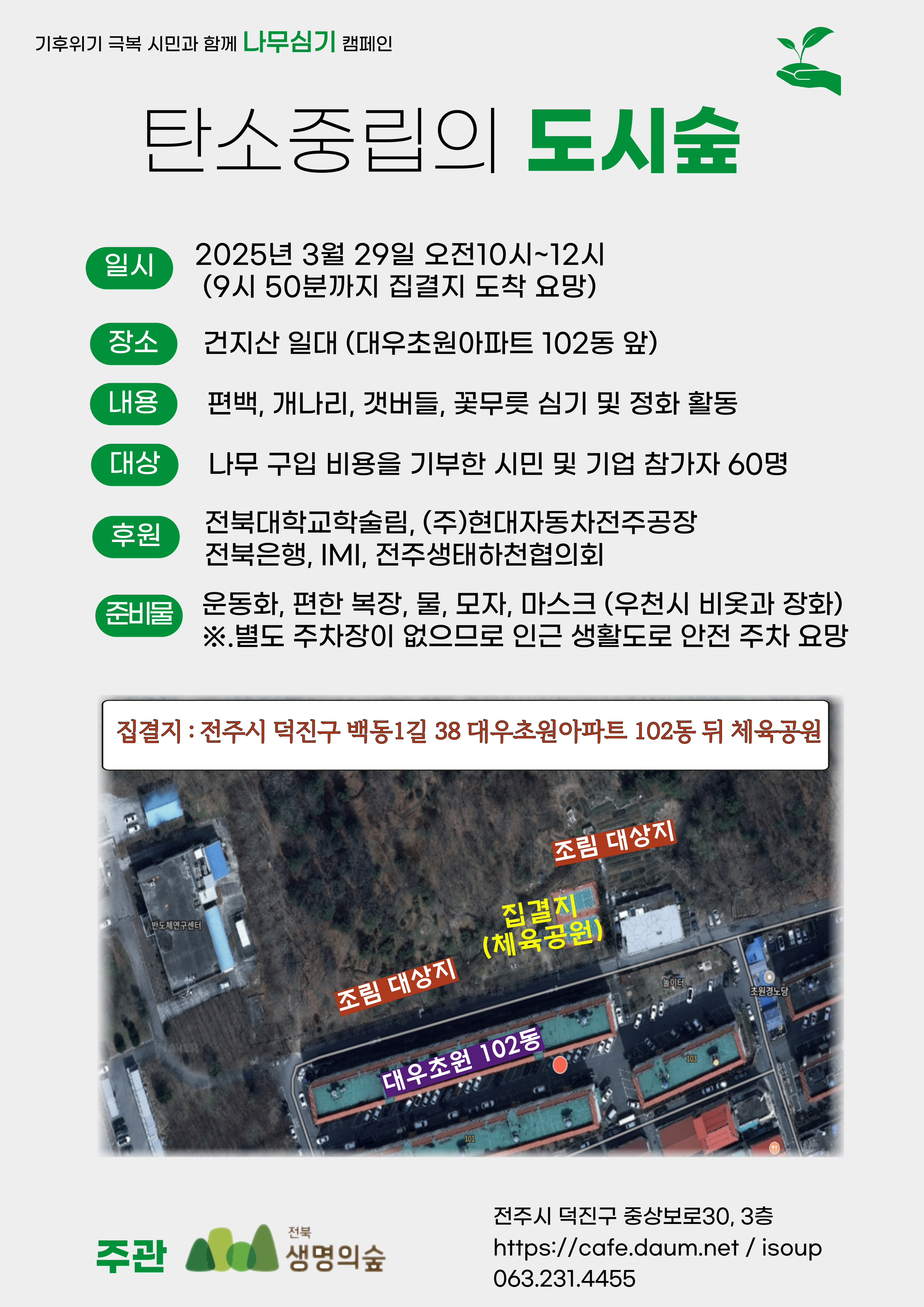 시민과 함께 나무 심기_3/29(토) 행사 참가자 공지사항 작성자관리자|작성시간25.03.26|조회수141 목록 댓글 0 글자크기 작게가 글자크기 크게가 기후위기 극복 시민과 함께 나무심기 캠페인에 귀한 물질과시간으로 후원해 주신 모든분께 깊이 감사드립니다.다음 사항을 참조하시고 3월 29일(토) 9시 50분까지 집결지에 도착해 주시기 바랍니다. 다음검색 현재 게시글 추가 기능 열기 북마크 공유하기 신고 센터로 신고 댓글 댓글 0 댓글쓰기 답글쓰기 댓글 리스트