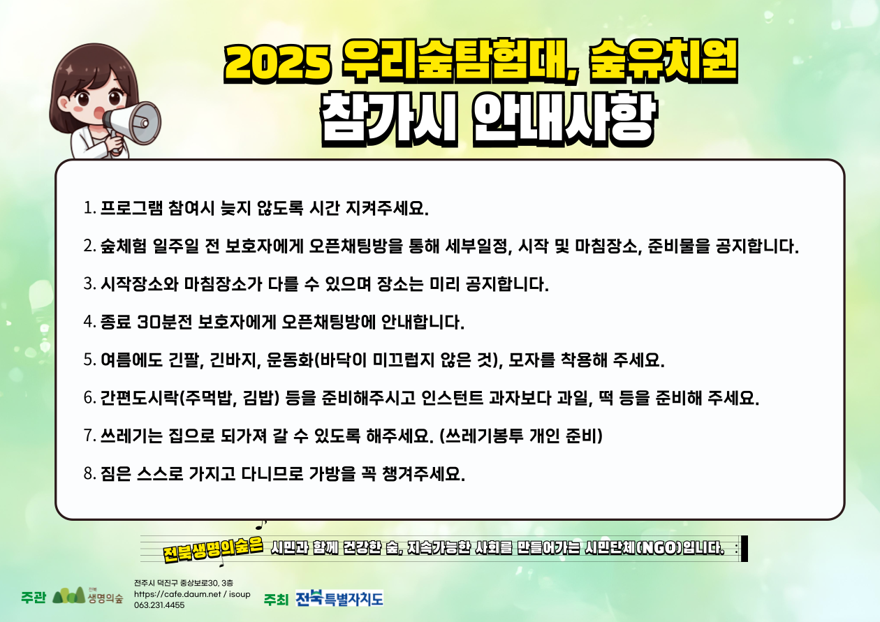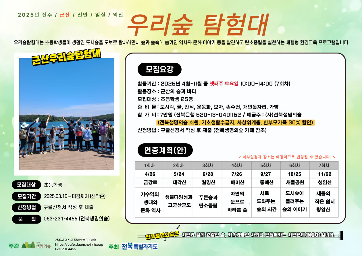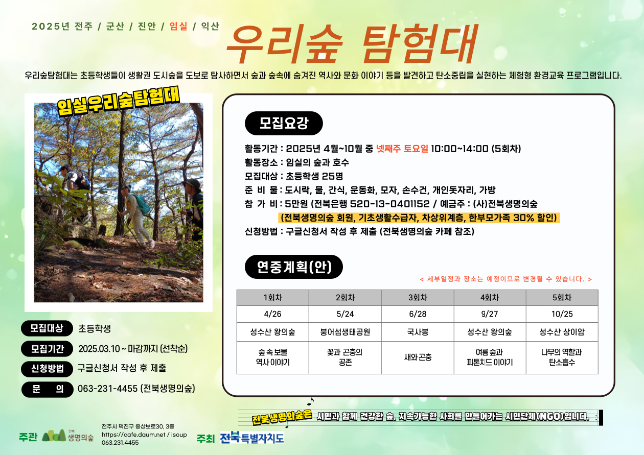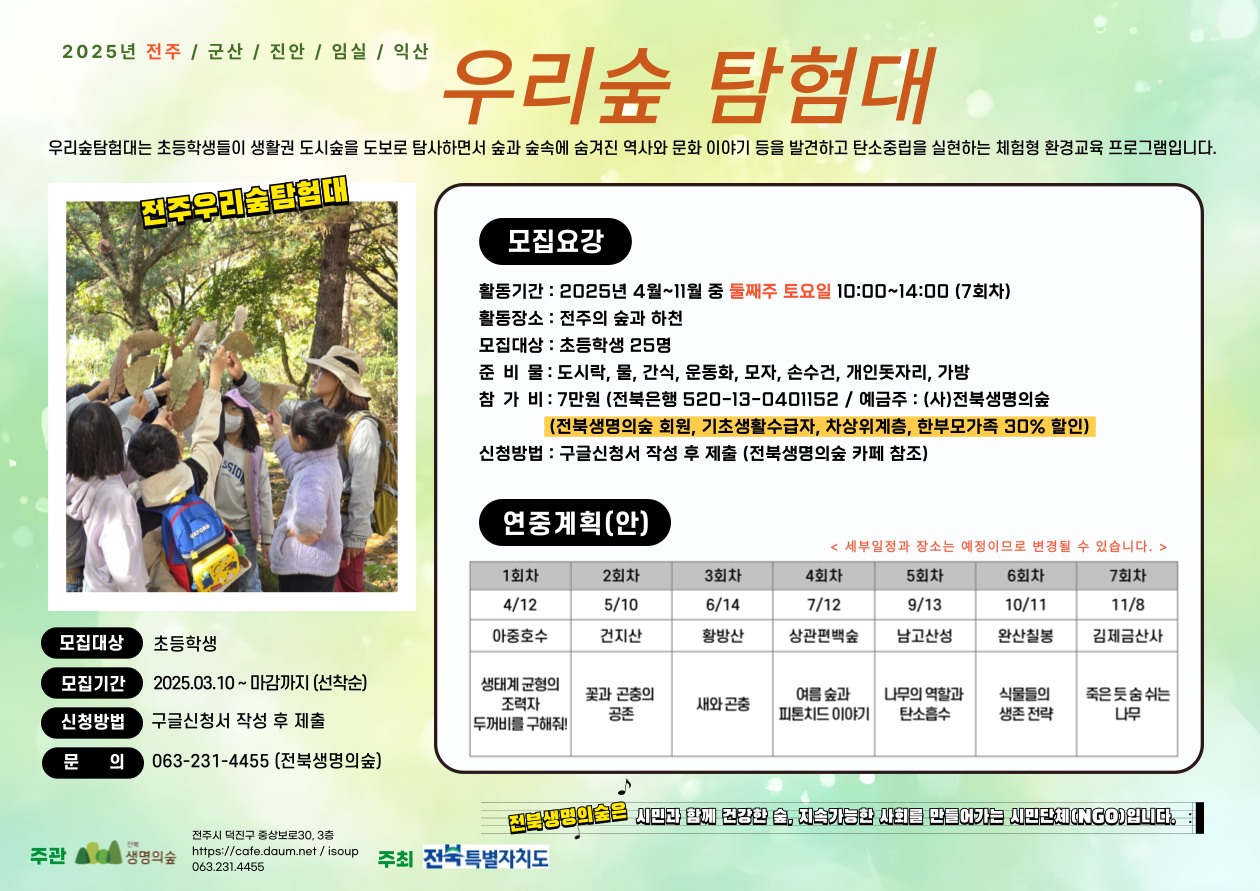 전북생명의숲에서는 2025년도 초등 숲체험프로그램에 함께할 "우리숲 탐험대원"을 모집합니다.