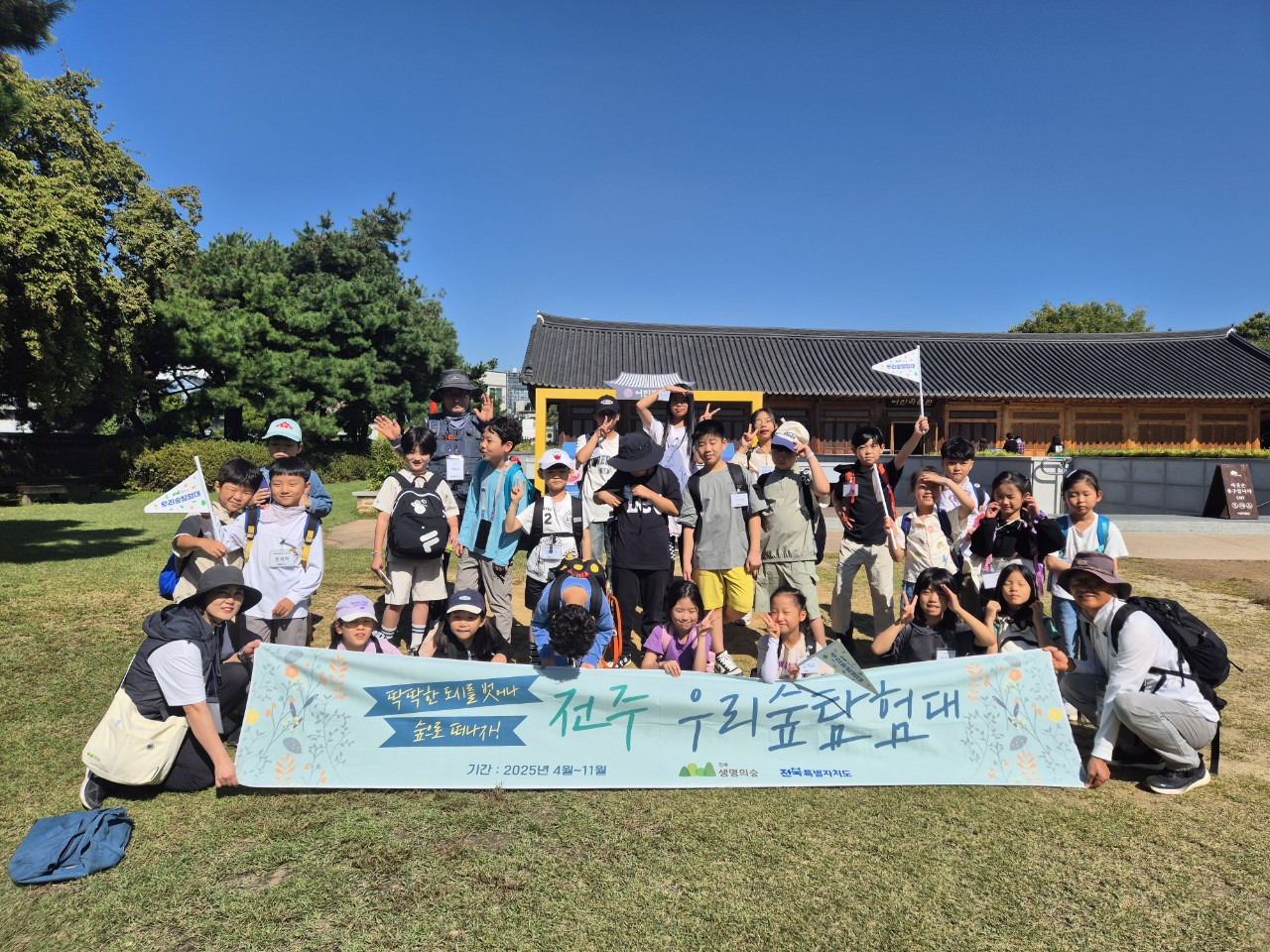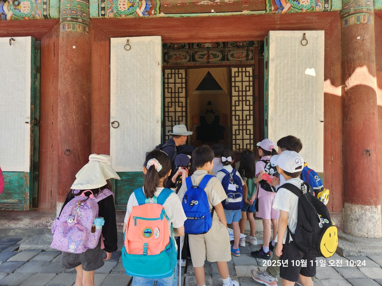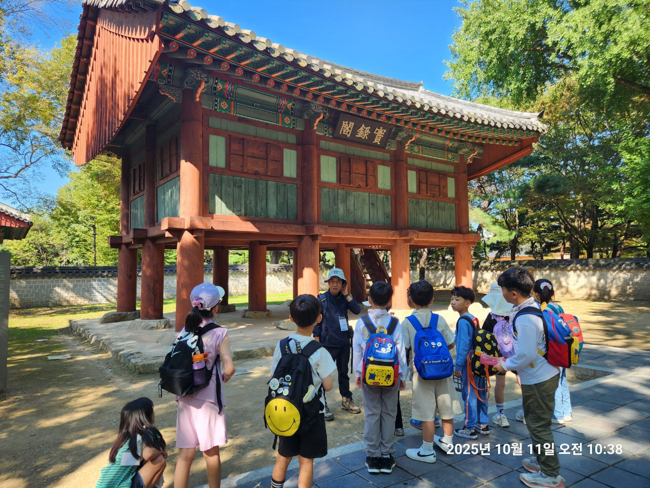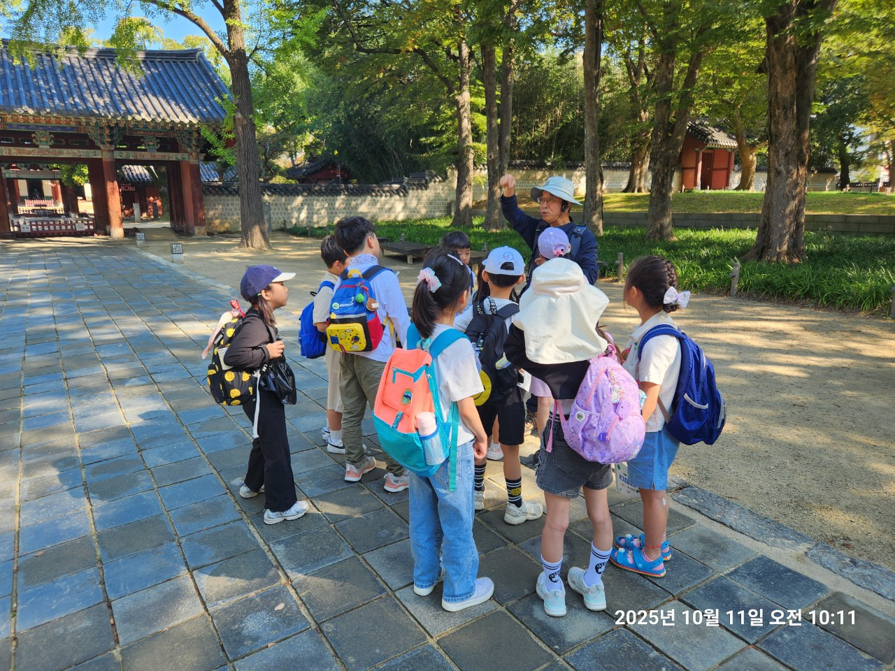 오늘 첫 방문지 경기전에 들렀다. 입구 하마비 역할 및 받치고 있는 해치 암 수를 구별하기도 하였다. 처음에는 숲탐험보다 역사시간이라 학생들이 따분해 할줄 알았는데, 대꾸도 잘 해주고 조선시대 임금님 순서를 암기 하는것을 보고 놀라웠다.