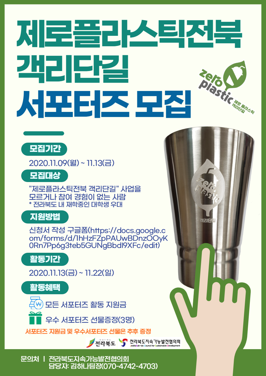 전라북도지속가능발전협의회에서 미래세대와 지속가능한 지구를 위해 1회용 플라스틱 사용을 줄이는 제로플라스틱전북 객리단길에서 서포터즈를 모집합니다.