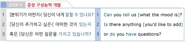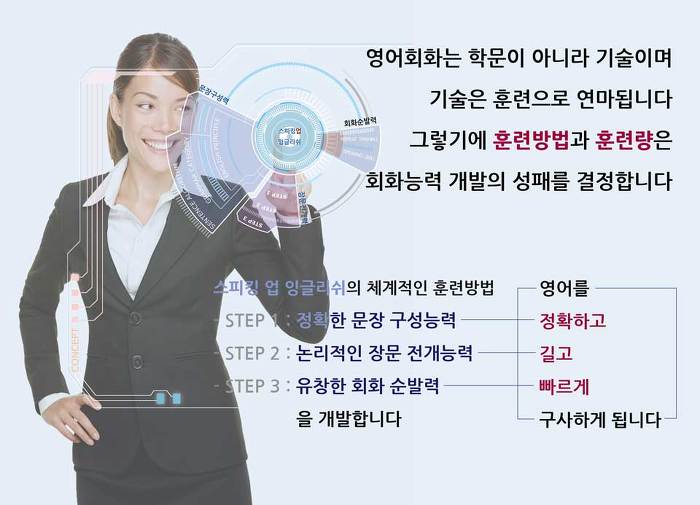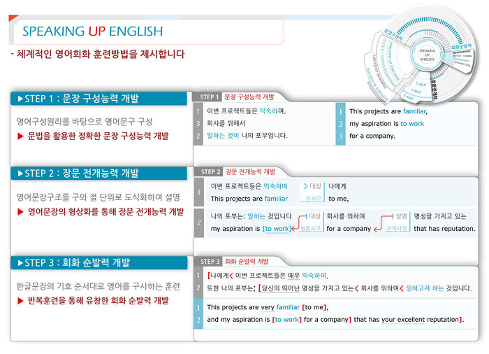 영어 말하기를 잘할 수 있는 가장 확실한 영어회화 학습방법을 소개합니다. 영어를 보면서 영어 말하기 - 영어가 늘지 않습니다. 영어를 듣고 영어 따라하기 - 영어가 늘지 않습니다. 영어를 스스로 구사해야만 영어회화능력이 개발됩니다. 즉, 영어를 스스로 구사하는 연습을 함으로써 영어문장을 생성하는 논리회로를 머리속에 형성하게 됨니다. 스스로 학습하여 논리회로를 형성하는 알파고처럼 영어를 스스로 구사하는 연습을 하면서 영어문장 생성 논리회로를 두뇌에 형성해야 합니다. 그러나 어떻게 영어를 스스로 구사할 수 있을까요, 그 대안은 한글을 보고 영어를 스스로 구사하는 학습입니다. 스피킹 업↑ 잉글리쉬!! 그 방법을 알아봅니다. 영어를 잘한다는 것은 영어를 ▶정확하고 ▶길고 ▶빠르게 구사한다는 의미입니다. 이를 위해 ▶ 정확한 문장 구성능력 ▶ 논리적인 장문전개능력 ▶ 유창한 회화 순발력을 개발해야 합니다. 고급수준의 영어를 유창하게 할 수 있는 신개념 영어회화 학습법을 소개합니다. 1. 정확한 문장 구성능력 개발 방법 문법을 체계적으로 설명할 수 있는 영어구성원리를 활용하여 정확한 기본문장 구성을 연습합니다. ※ 영어구성원리의 대략적인 설명 1. 문장골격구성 2. 동사형태 적용 3. 문구 꾸미기 4. 대상 설명하기로 영어구성원리를 이루고 있습니다. 이를 바탕으로 영어를 생성하는 논리회화를 두뇌에 형성하게 됩니다. (자세한 사항은 '스피킹업 잉글리쉬' 책자를 참조하세요, 영어를 완벽하게 할 수 있습니다) 2. 논리적인 장문 전개능력 개발 방법 STEP 1의 문장을 바탕으로 문구를 추가합니다. 아래와 같이 도식화된 문장구조를 보면서 장문의 영어문장 형태를 머리속에 형상화하게 됩니다. 3. 유창한 회화 순발력 개발 방법 이제 본격적으로 고급영어회화를 연습을 하게 됩니다. 한글문장의 기호 순서대로 영어를 반복하여 구사함으로써 유창한 회화능력을 개발하게 됩니다. STEP 3에서 한글문장의 기호를 보면서 영어 말하기를 반복해 보세요. 이러한 연습의 반복을 통하여 영어를 생성하는 논리회로를 두뇌에 형성하면서 해외어학연수 수준의 영어회화능력을 개발하게 됩니다!!. STEP 3를 반복함으로써 해외어학연수 수준의 회화능력을 개발하게 됩니다. 체계적인 훈련방법과 충분한 훈련량을 제공하는 책 스피킹업 잉글리쉬 단지 16,000원으로 어학연수 수준의 회화능력을 개발할 수 있습니다. 해당서점을 클릭하시면, 스피킹업 잉글리쉬를 집적 구입할 수 있습니다. 영어를 잘할 수 있는 가장 확실한 책 - 스피킹업 잉글리쉬 저자 정연국 : 서울대학교 졸업, 외국회사에서 시스템 컨설턴트로 근무했습니다. (삼성SDS, 네덜란드 ING, 프랑스 BNP Paribas, 인도 TCS, 미국 EDS 등) 영어문장구조를 체계적으로 습득할 수 있는 커리큘럼을 바탕으로 실전영어를 완벽하게 구사할 수 있는 학습서를 저술하고 있습니다. |