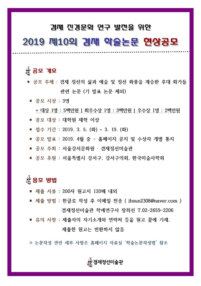 [서울][겸재정선미술관] 2019. 제10회 겸재 학술논문현상공모 작성자희선|작성시간18.12.01|조회수3 목록 댓글 0 글자크기 작게가 글자크기 크게가 다음검색 현재 게시글 추가 기능 열기 북마크 공유하기 신고 센터로 신고 댓글 댓글 0 댓글쓰기 답글쓰기 댓글 리스트