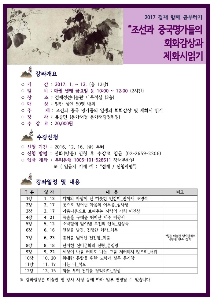 [겸재정선미술관] 2017. 겸재 함께 공부하기 강좌 안내 작성자희선|작성시간16.12.21|조회수5 목록 댓글 0 글자크기 작게가 글자크기 크게가 ※ 자세한 사항은 미술관 홈페이지 공지사항(http://gjjs.or.kr) 확인 바라며, 많은 참여 부탁드립니다. 감사합니다. 다음검색 현재 게시글 추가 기능 열기 북마크 공유하기 신고 센터로 신고 댓글 댓글 0 댓글쓰기 답글쓰기 댓글 리스트