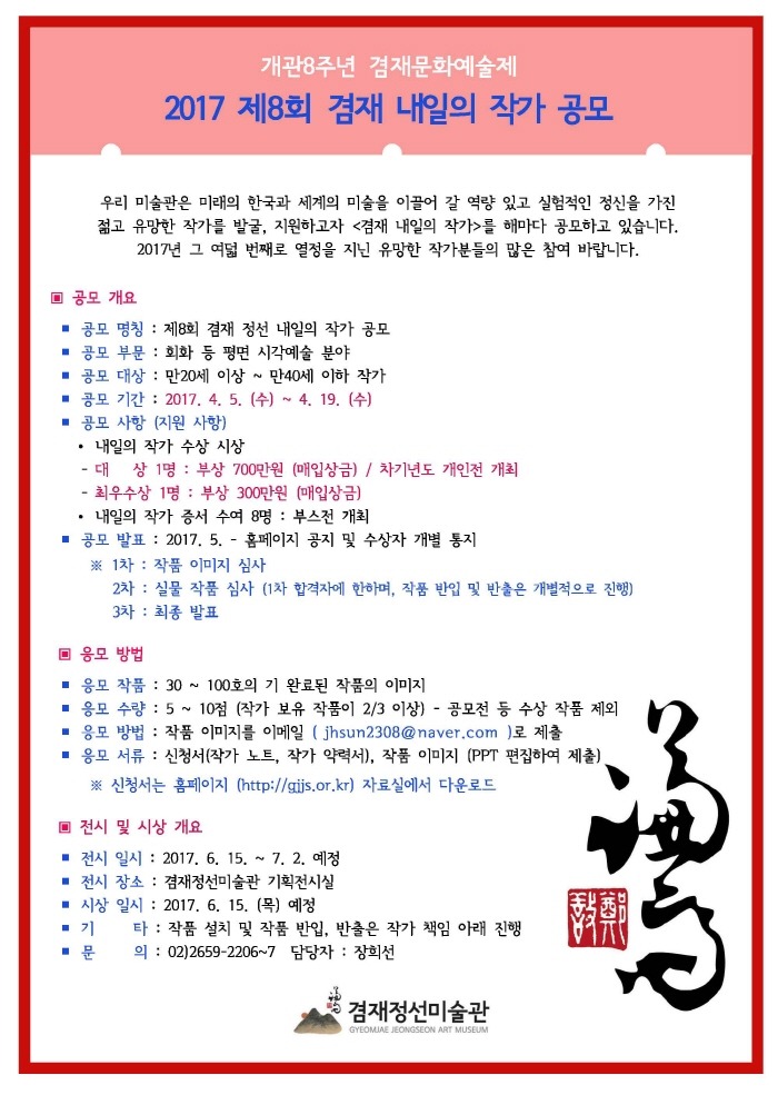 [겸재정선미술관] 2017. 제8회 겸재 내일의 작가 공모 작성자희선|작성시간16.12.27|조회수3 목록 댓글 0 글자크기 작게가 글자크기 크게가 ※ 자세한 사항은 미술관 홈페이지 공지사항(http://gjjs.or.kr) 확인 바라며, 많은 참여 부탁드립니다. 감사합니다. 다음검색 현재 게시글 추가 기능 열기 북마크 공유하기 신고 센터로 신고 댓글 댓글 0 댓글쓰기 답글쓰기 댓글 리스트