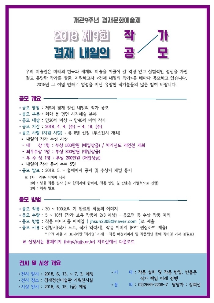 [겸재정선미술관] 2018. 제9회 겸재 내일의 작가 공모 작성자희선|작성시간17.07.07|조회수4 목록 댓글 0 글자크기 작게가 글자크기 크게가 ※ 자세한 사항은 미술관 홈페이지 공지사항(http://gjjs.or.kr) 확인 바라며, 많은 참여 부탁드립니다. 감사합니다. 다음검색 현재 게시글 추가 기능 열기 북마크 공유하기 신고 센터로 신고 댓글 댓글 0 댓글쓰기 답글쓰기 댓글 리스트