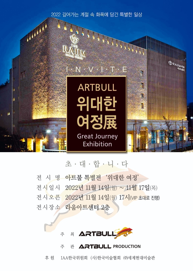 《2022 위대한 여정》 특별전이 탈 서울, 탈 한국이라 평가 받는 강남 문화예술의 중심인 "RAUM ART CENTER"에서 펼쳐진다. 한여름밤의 꿈의 반대쪽 계절일지라도 한편의 영화처렴, 또 온몸을 휘감는 화폭으로 가족을 사랑하는 마음으로 다가온 겨울이라도 따뜻이 맞이할 수 있게 한다.