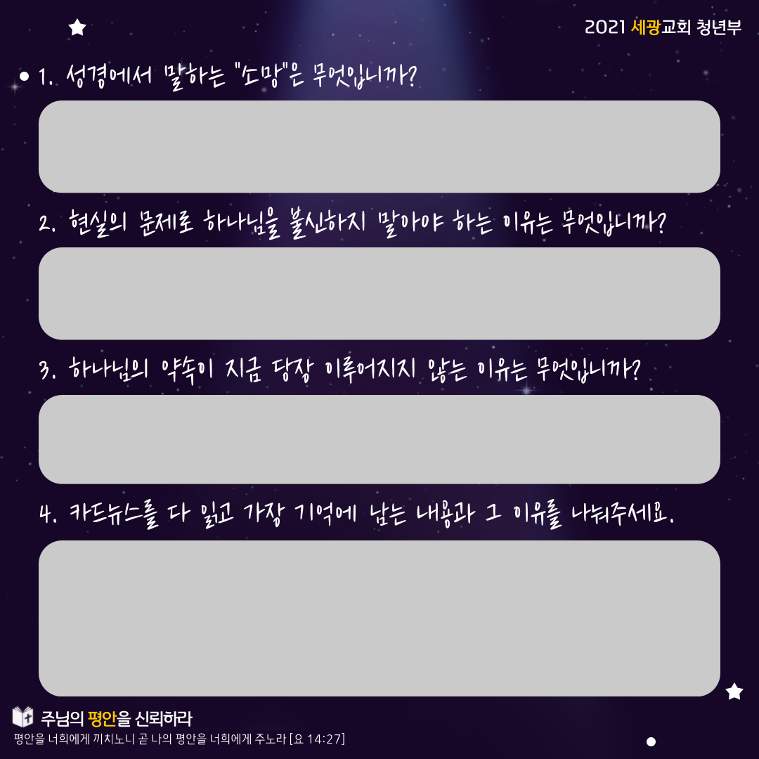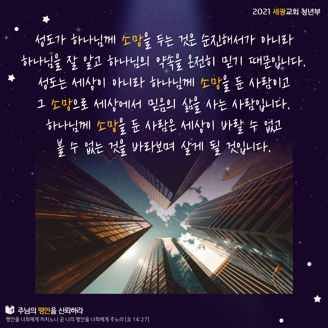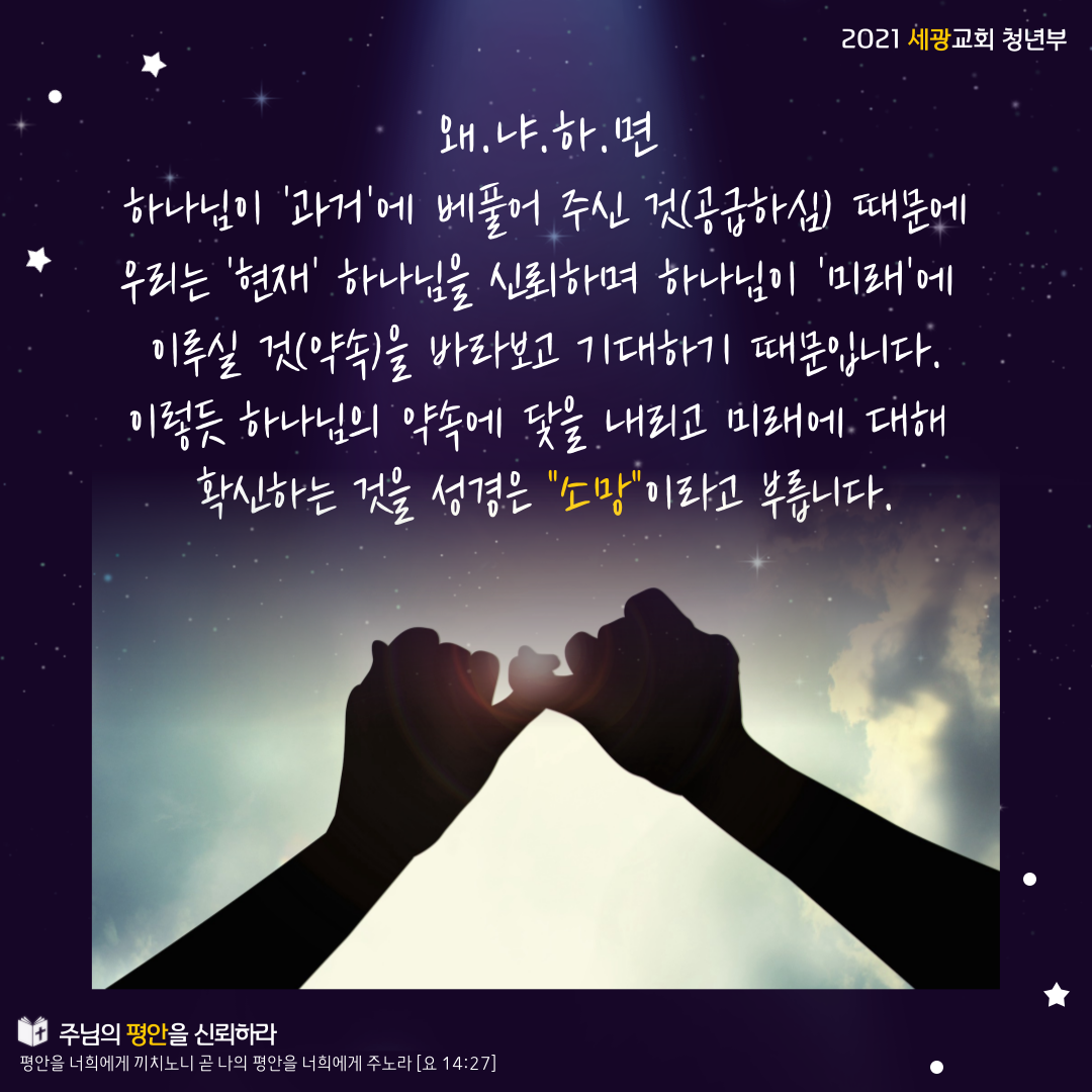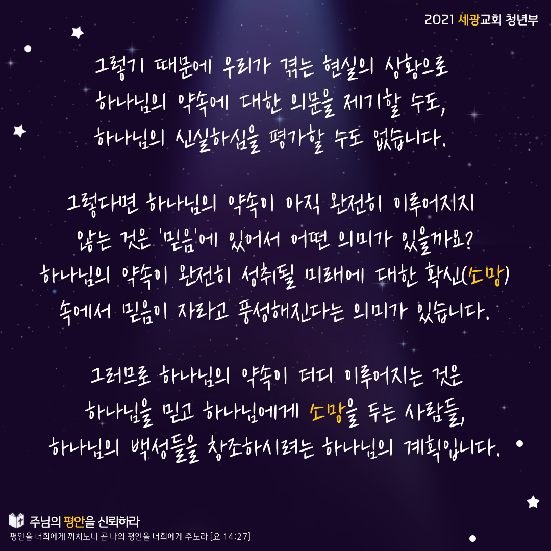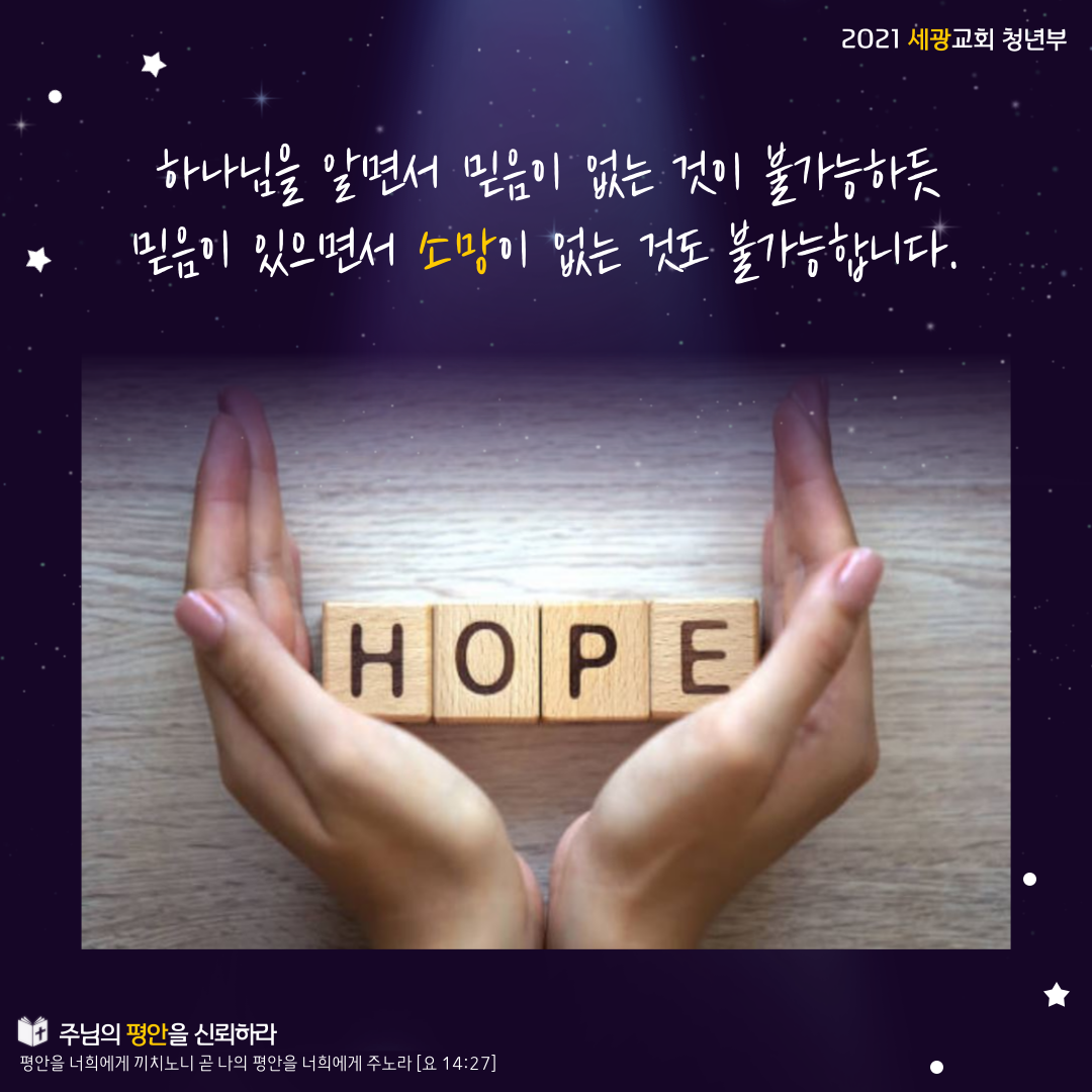 믿음과 소망 - 하나님의 약속이 주는 교훈 (20210321 청년부 성경공부) 작성자김성현|작성시간21.03.21|조회수38 목록 댓글 0 글자크기 작게가 글자크기 크게가 다음검색 현재 게시글 추가 기능 열기 북마크 공유하기 신고 센터로 신고 댓글 댓글 0 댓글쓰기 답글쓰기 댓글 리스트