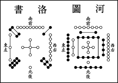 하도(오른쪽)는 용마의 목과 등의 무늬가 그림 같아서 圖라 하였을 것이고, 낙서(왼쪽)는 거북 등이 갈라져 점을 이룬 것이 글자와 비슷해서 書라고 하였을 것이다. 오늘날 도서관이라 할 때의 圖書가 여기서 나온 듯.