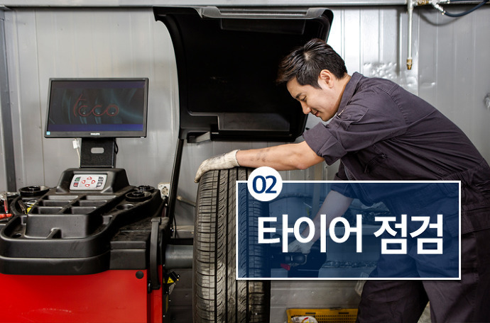 타이어는 평소 공기압에 비해 10~15% 가량 더 높게 주입하는 것이 좋은데요~ 타이어가 찌그러지면 파손 위험도 커지기 때문이죠. 공기압과 함께 타이어 마모도를 함께 체크해주어야 해요. 타이어의 홈은 마찰로 일어나는 열을 발산하는 역할을 한답니다. 그래서 타이어가 과도하게 마모되어있을 경우 타이어 파열을 일으킬 위험이 있죠. 타이어 마모가 심하지 않더라도, 출고 또는 교체 후 5~6년이 경과했다면 꼭 점검 받는 것을 권장합니다~