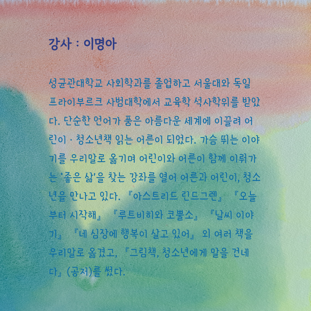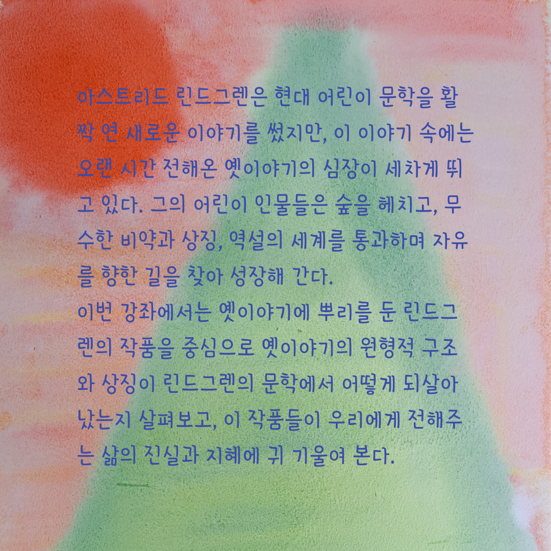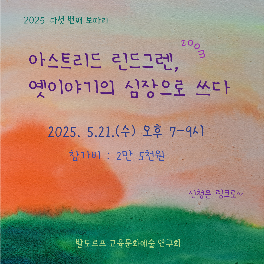 <아스트리드 린드그렌, 옛이야기의 심장으로 쓰다> 이명아 번역가님 강의입니다. 작성자돌멩이|작성시간25.04.22|조회수44 목록 댓글 0 글자크기 작게가 글자크기 크게가 https://forms.gle/NpaGnhSvJKU4eb1e92025 다섯 번째 보따리: 참가 신청서* 주제 : 아스트리드 린드그렌, 옛이야기의 심장으로 쓰다 * 행사 기간: 5월 21일(수) 오후 7시~9시(온라인 강의) * 참가비: 2만5천원 (카카오뱅크 3333 1950 26755 김혜정) "000 심장"으로 입금 부탁드립니docs.google.com 다음검색 현재 게시글 추가 기능 열기 북마크 공유하기 신고 센터로 신고 댓글 댓글 0 댓글쓰기 답글쓰기 댓글 리스트