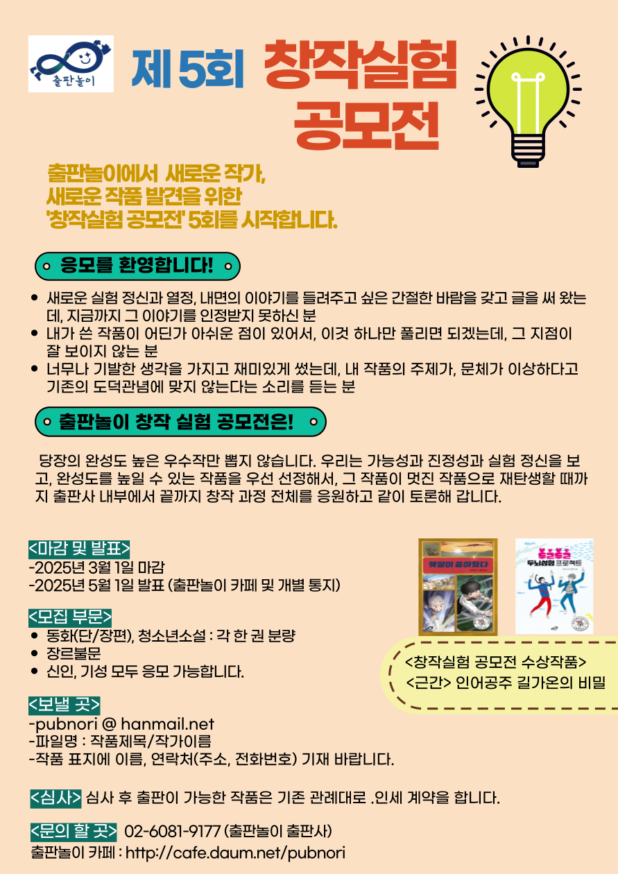 제5회 출판놀이 <창작실험 공모전> 25년 3월 1일 마감 작성자래미|작성시간24.12.01|조회수73 목록 댓글 0 글자크기 작게가 글자크기 크게가 다음검색 현재 게시글 추가 기능 열기 북마크 공유하기 신고 센터로 신고 댓글 댓글 0 댓글쓰기 답글쓰기 댓글 리스트