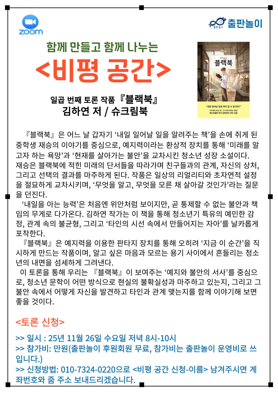 어린이 청소년문학 <비평공간>일곱 번째 토론 <블랙북> 2025년 11월 26일 수요일 저녁 8-10시 작성자출판놀이|작성시간25.11.06|조회수40 목록 댓글 0 글자크기 작게가 글자크기 크게가 다음검색 현재 게시글 추가 기능 열기 북마크 공유하기 신고 센터로 신고 댓글 댓글 0 댓글쓰기 답글쓰기 댓글 리스트