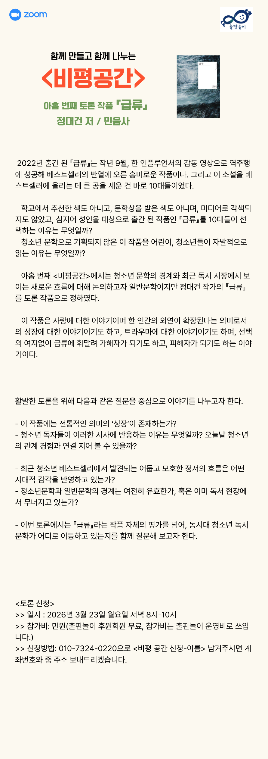 어린이 청소년문학 <비평공간>아홉 번째 토론 <급류> 2026년 3월 23일 월요일 저녁 8-10시 작성자출판놀이|작성시간26.03.02|조회수24 목록 댓글 0 글자크기 작게가 글자크기 크게가 다음검색 현재 게시글 추가 기능 열기 북마크 공유하기 신고 센터로 신고 댓글 댓글 0 댓글쓰기 답글쓰기 댓글 리스트