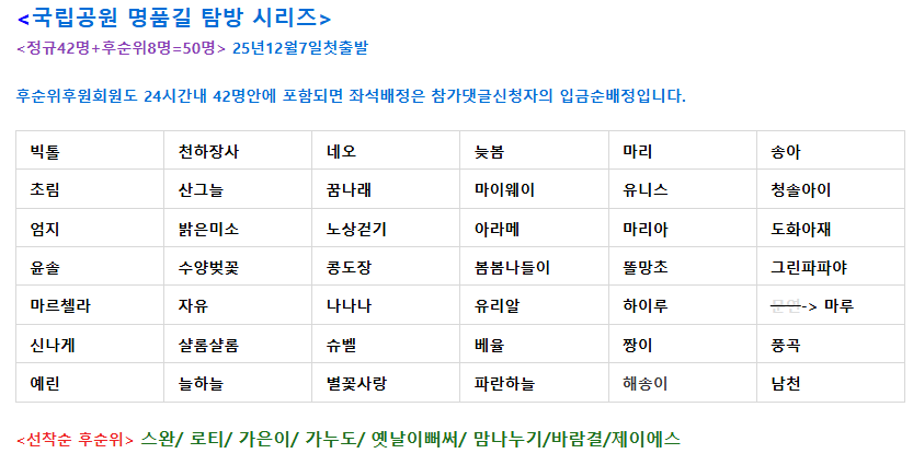 | 참석신청방법 | 동행으로는 참석할 수 없으니, 함께 걷고자 하는 분이 계시면 회원 가입후에 신청하십시오. 먼저 아래 계좌로 입금 후... 예시처럼 꼭 참석 댓글을 달아주세요. (후원참석번호/닉네임/입금자명/남녀표시/전화번호/탑승지/하고 싶은 말... ) (일반참석번호/닉네임/입금자명/남녀표시/전화번호/탑승지/하고 싶은 말... ) (입금시 닉명이 아니면 실명전부를 적어야 합니다.) (입금 후 1시간내에 참석 댓글이 없으면 좌석순위에서 밀릴 수도 있습니다.) (입금과 참석댓글 동시충족이 필요하며 입금자 우선입니다.) (별도의 특별공지가 있을시 공지내용 미충족시 순위가 밀릴 수도 있습니다.) (마감후 무단입금시 불이익이 부과되며 미입금대기는 불가합니다.) (좌석배정은 입금순서등 내부규정에 따르므로 좌석지정및 부탁글을 적으면 안됩니다.) (자동마감장치가 없으니 신청회원은 대기를 원치않을시는 참석인원을 파악한 후 신청해주세요) | |
